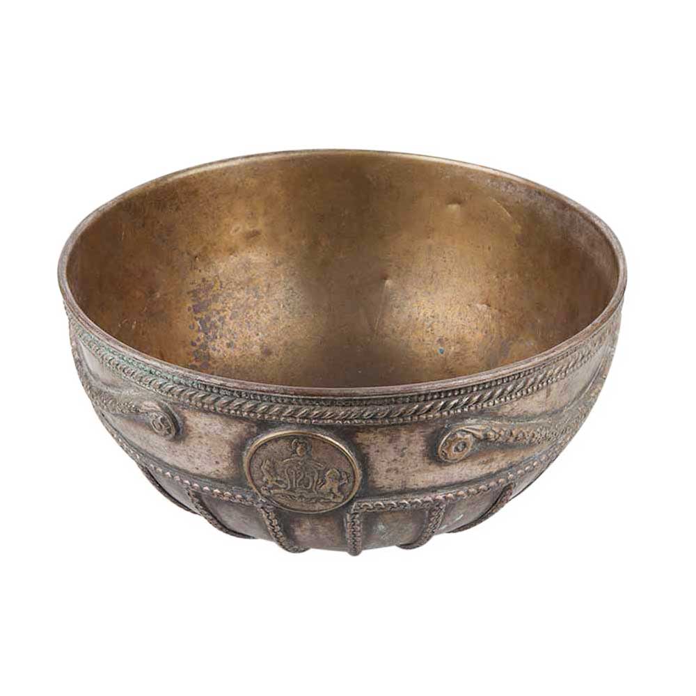 Hand chiseled brass bowl with embossed floral bands Mohan meakin limited embossed on it and logo made of eagle and lion on the either side of 125 in a bracket. Use it as a fruit bowl, showpiece, to display fresh flowers and plants, as a gift for near and dear ones in diwali, christmas new year and house warming.