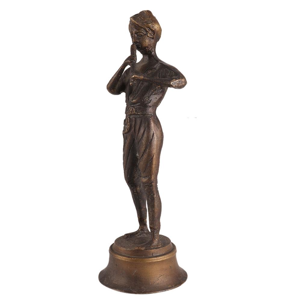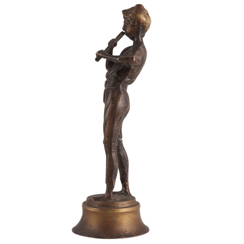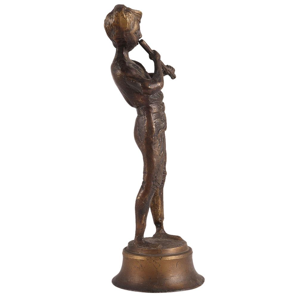 Brass statue of a boy playing the flute from the second half of the twentieth century. This boy used to be a hunter boy from World War I. He's not wearing any shoes, and it could be a scene of him playing the flute around displaced persons during the war.