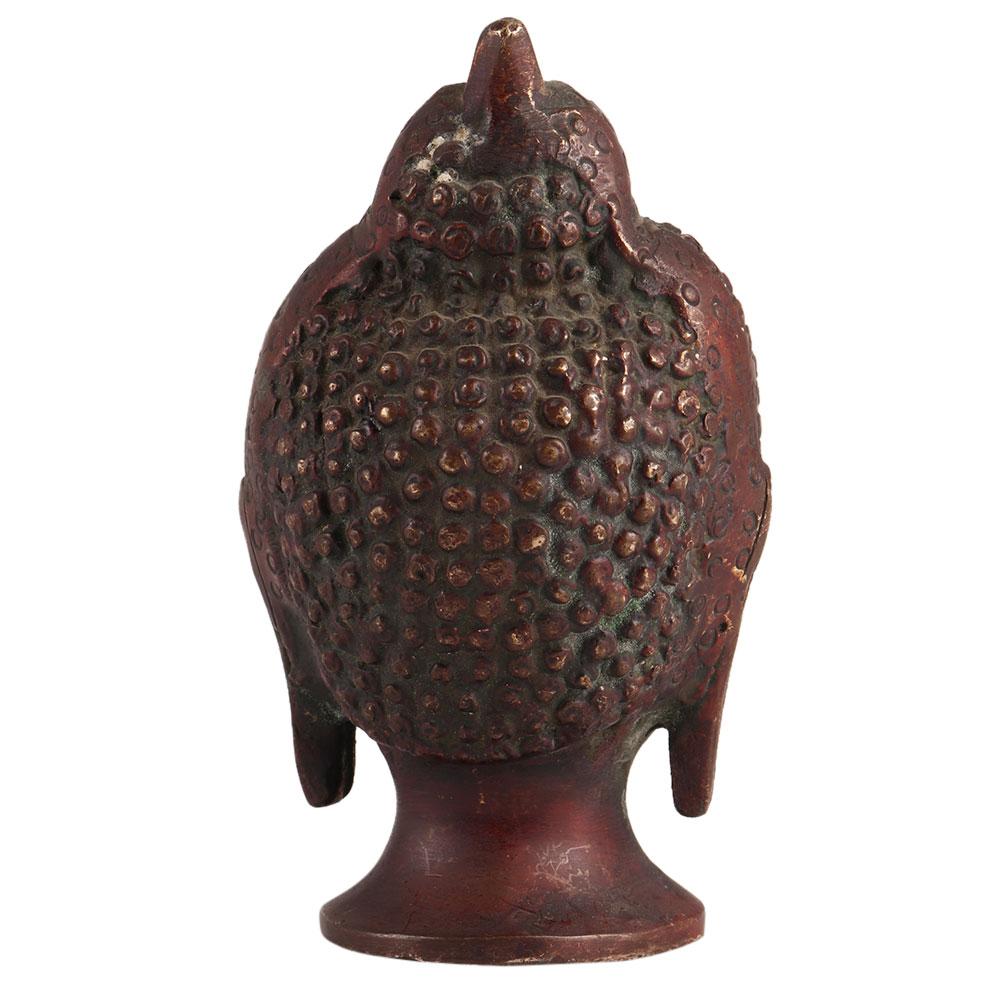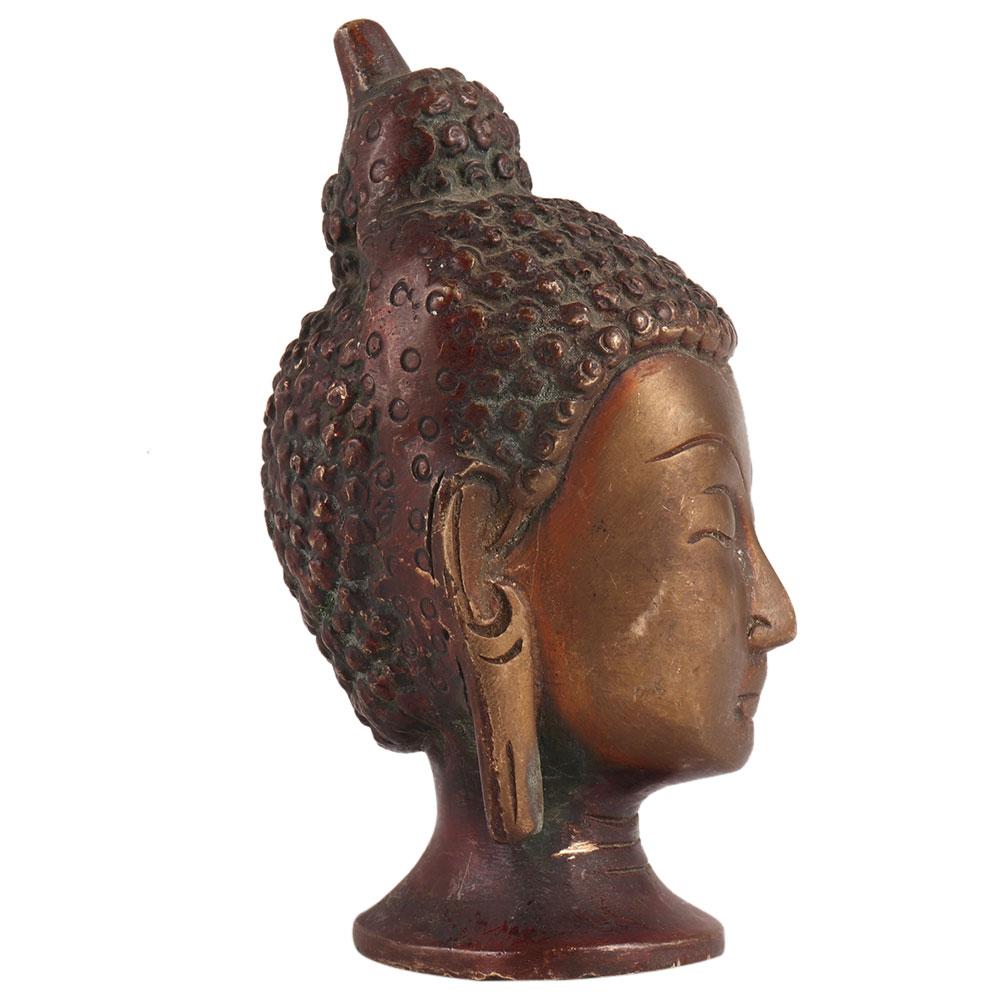 This small brass Buddha head statue has a serene expression on his face and his eyes are brooding in silent meditation. In his princely youth, his earlobes were enlarged from wearing heavy gold earrings. His hair is styled in tight, seashell curls. The statue has a lovely dark brown patina. The Buddha head is ideal for any home altar or shrine.