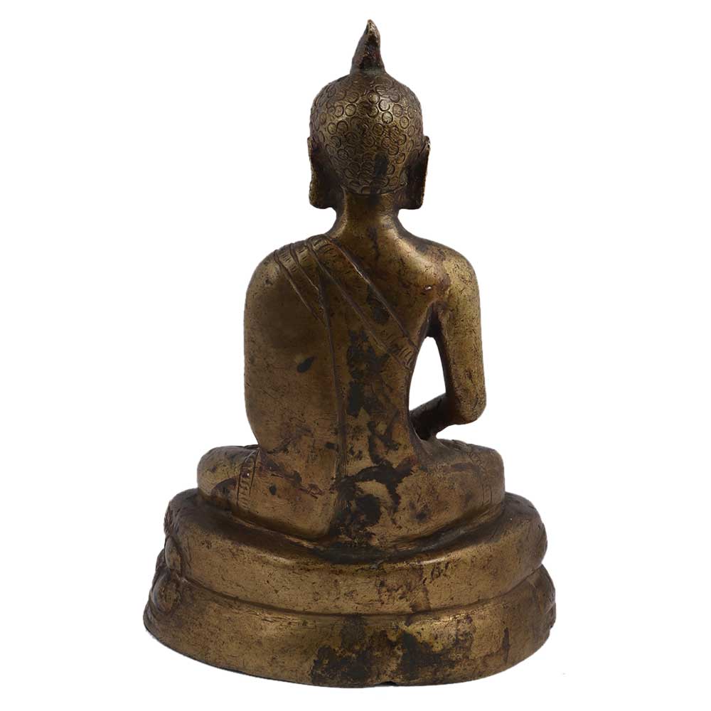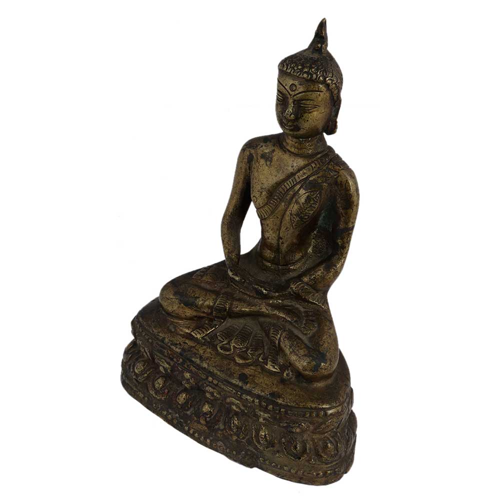Brass Buddha Statue Sitting In Meditation is seated on a lotus platform has a very peaceful face with fine carvings on the robe . Place it on the desk of your office, study table or display unit of your living rom.