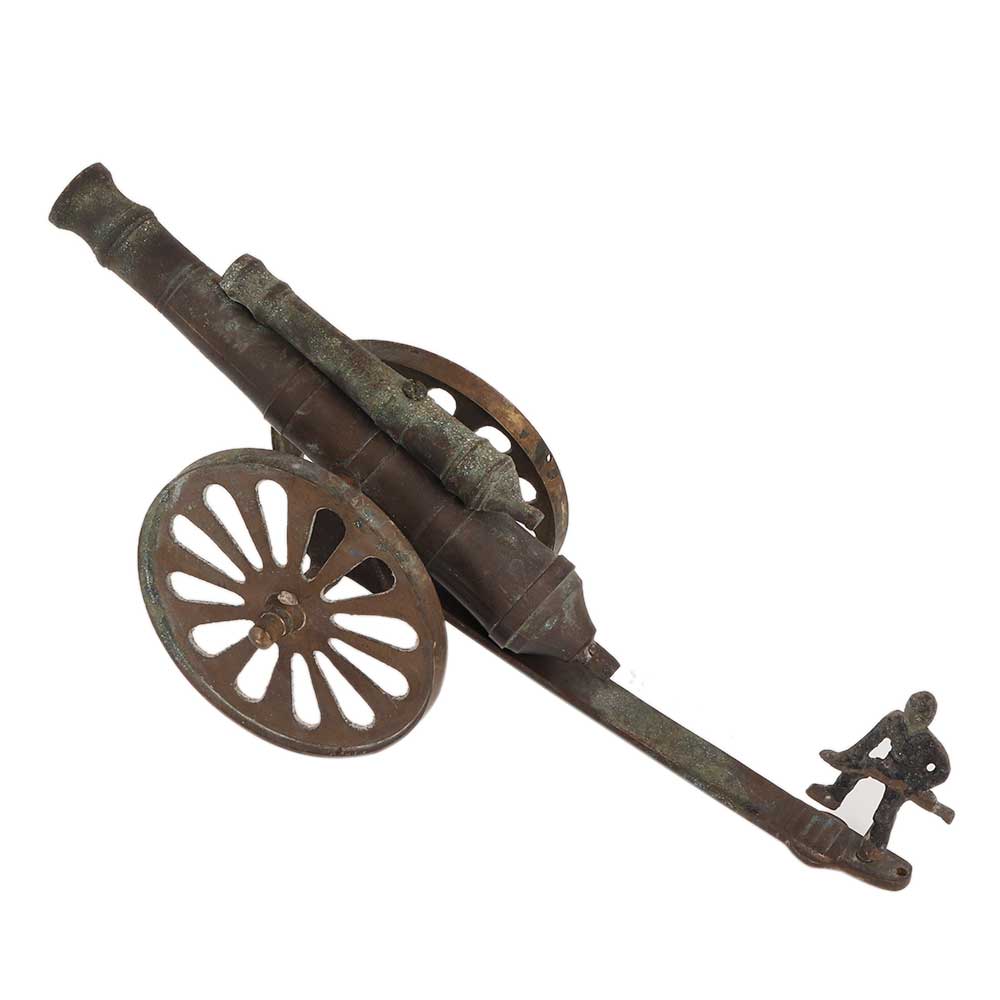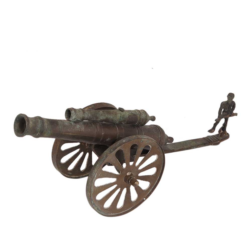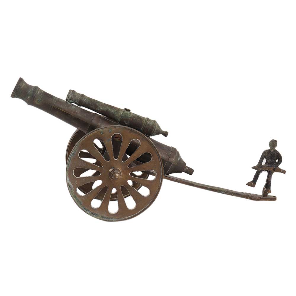 Brass Cannon With Solider Table Decoration is a fusion of art and history will certainly provide your home the royal look. it's an ideal gift for friends and family who have a passion for history. ornamental brass cannon double barrel, desktop things home ornamentation handicrafts gift item, , tabletop, brass golden handicraft cannon offers royal look to your home.