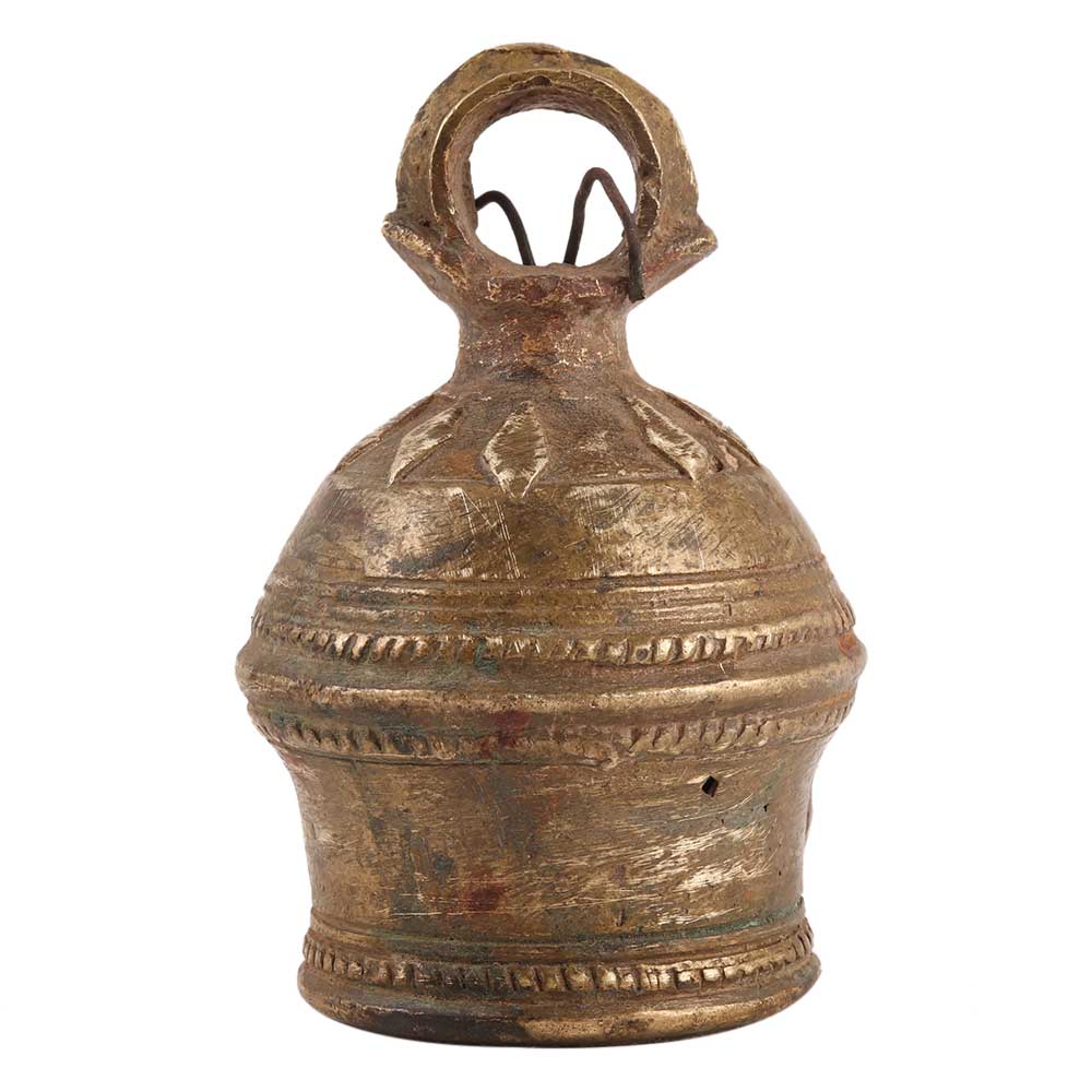 Complete your home's decor with this brass carved round shape Cow Bell, and add Indian flair to any room decor. This embossed Brass bell adds to the decoration and gives the home a safe and silent vibe. Ideal for both home and office use. A significant personal and professional collection. This handcrafted bell is ideal for gifting to friends and family.