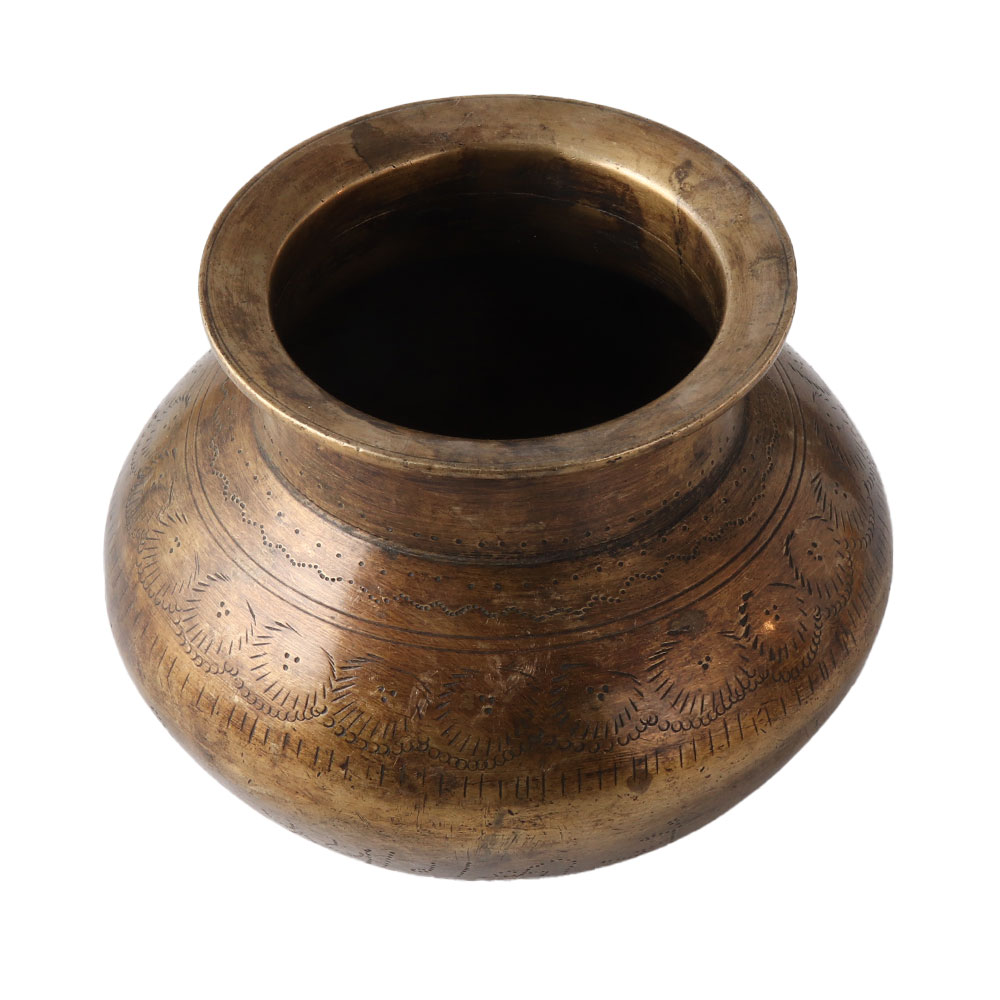 A large metal water pitcher that has been intricately carved with leaves and vines has a conventional circular shape, a wide opening, and a broad body. Use it as a flower vase, as wedding decor, or in hotel and bar reception areas. Excellent choice for a gift or a thank-you gift.