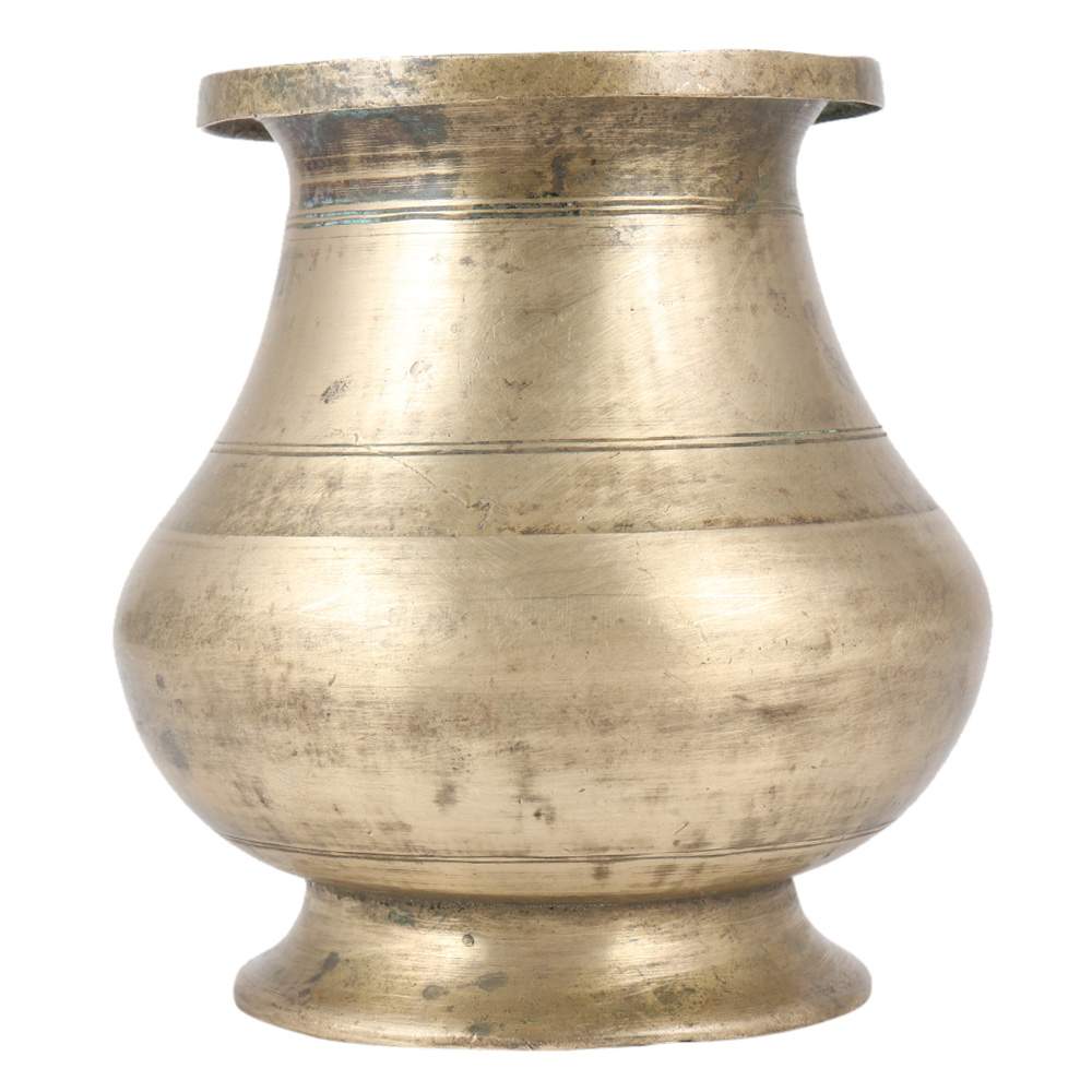 A beautifully patinated, tall and heavy old hindu holy water container or pot made of solid brass. This religious item is enhanced by its elegant form, simple lines, and exquisite casting. A fantastic piece that will bring intrigue to any room.
