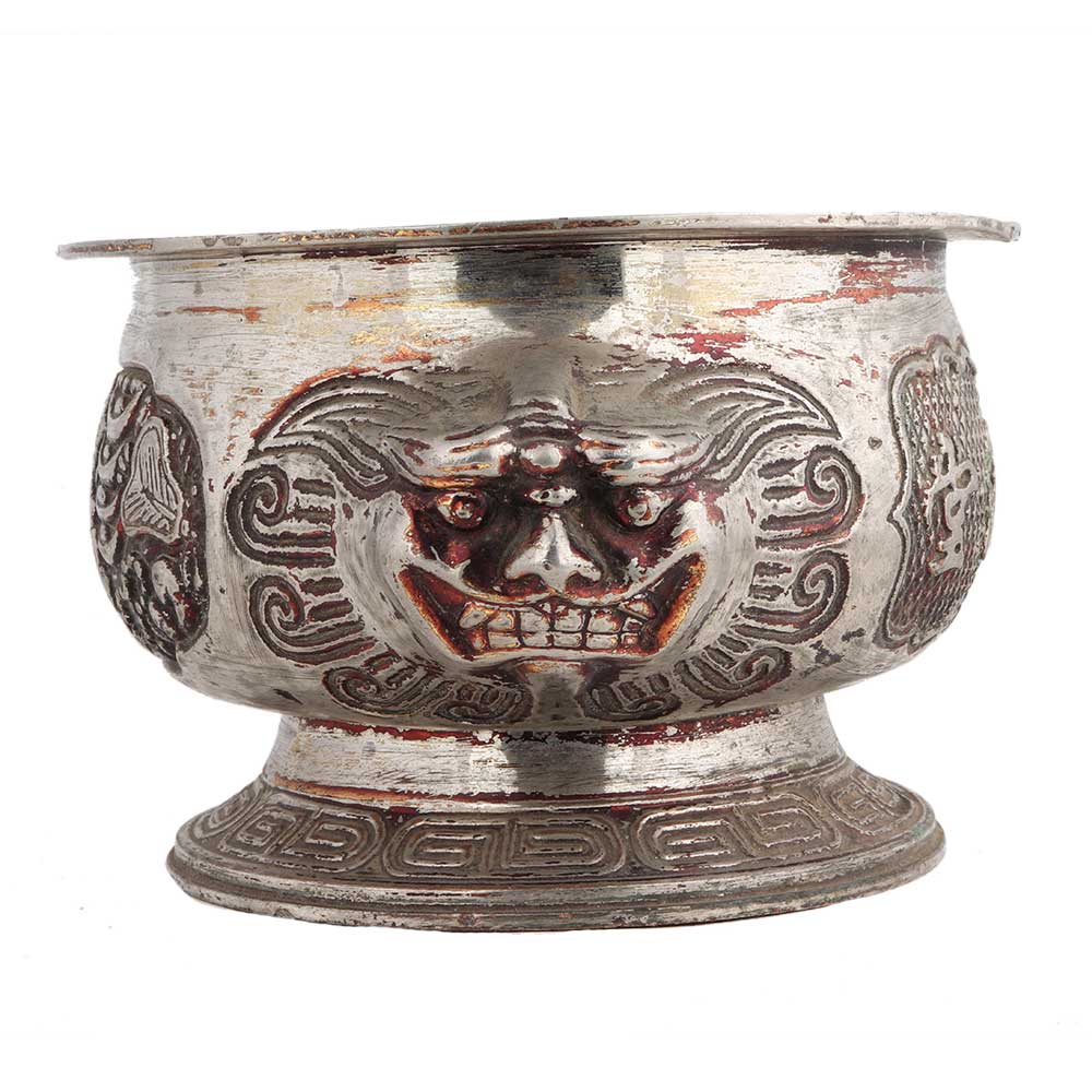 Brass Chinese Planter Engraved Lion Head And Chinese Inscription made for decoration and gifting etc with silver polish , it has fine engravings all over the pot with Chinese dragon as handles. Diwali gift, new year gift, wedding gift, indoor decoration of home , office and other social and corporate interiors.