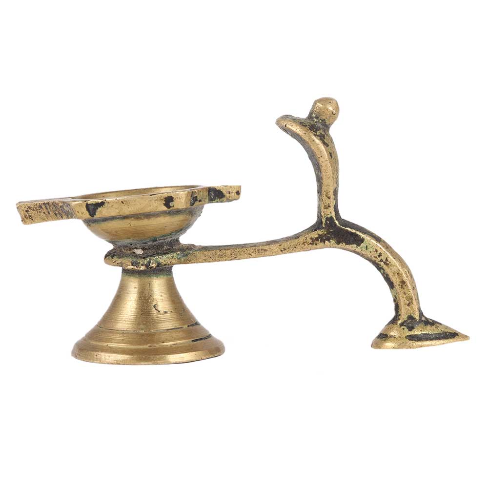 An attractive ancient brass lamp that was traditionally used to light diya oil lamps during aarti ceremonies in temples. Handmade in a pleasing design and engraved with a snake figure as an emblem of the Hindu god Shiva. It has a dark finish.