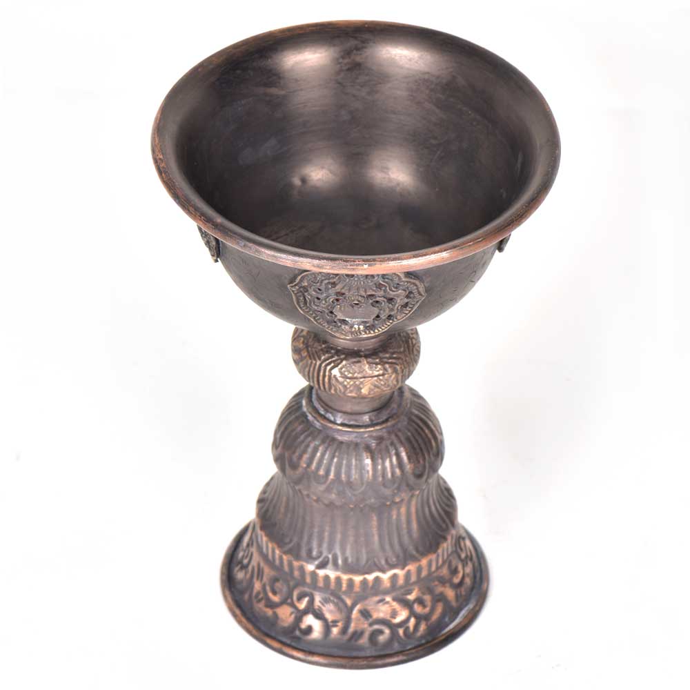 This traditional incense burner has a flared shape and is held by a thick and a decorative handle . It has an embossed design on the cup as well on the bottom of the handle The handle is long and thick as is gets heated up by burning coconut husk on which incense is sprinkled.