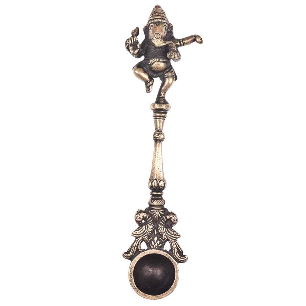 This is an intricately carved pooja spoon made of brass is used for offering worship during puja or havan . The spoon has a small bowl to fill holy water or oil with a decorative finial with dancing ganesha figurine on the top and bottom of the spoon . Use it as a home décor product or as a gifting option for family and friends