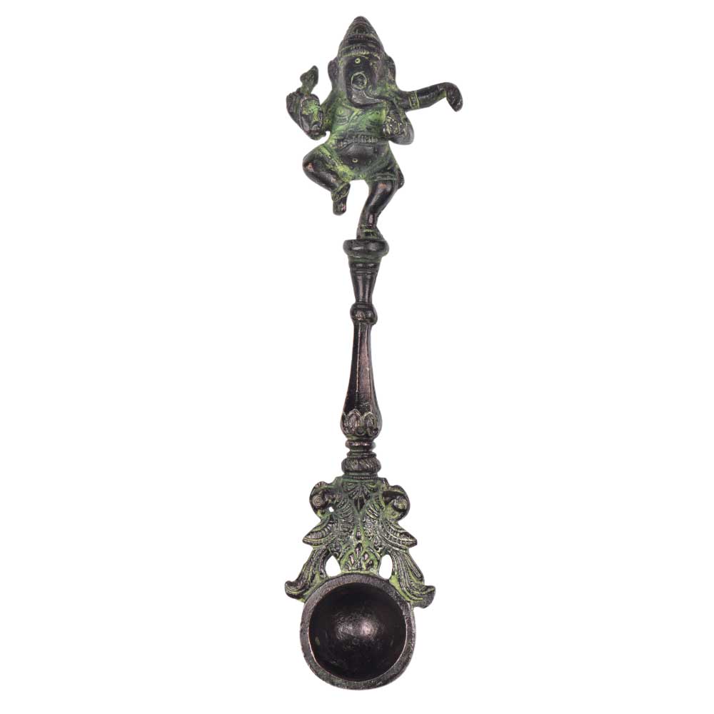 This is an intricately carved pooja spoon made of brass is used for offering worship during puja or havan . The spoon has a small bowl to fill holy water or oil with a decorative finial with dancing ganesha figurine on the top and bottom of the spoon . Use it as a home décor product or as a gifting option for family and friends