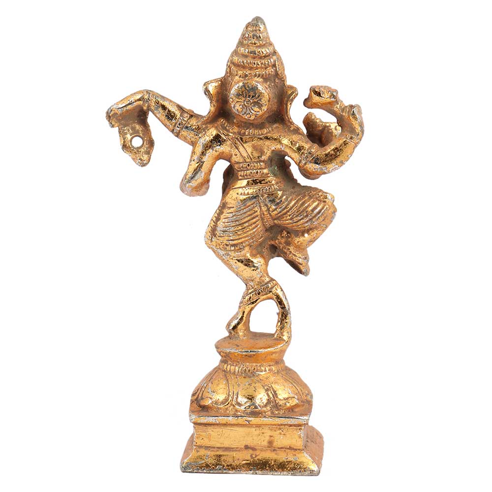 Brass Dancing Ganesha Statue In Golden Finish on one foot and the other rests on a lotus base . It can be used for worshipping, decoration .Diwali gift, wedding decoration, stage decoration and showpiece for your home interiors.