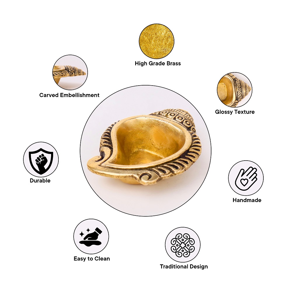 Bring divine energy into your home with the Brass Decorative Conch Shaped Oil Lamp. Designed in the sacred form of a conch (Shankh), this diya symbolizes purity, prosperity, and the eternal sound of Om, making it an auspicious choice for pooja rituals and festive décor.