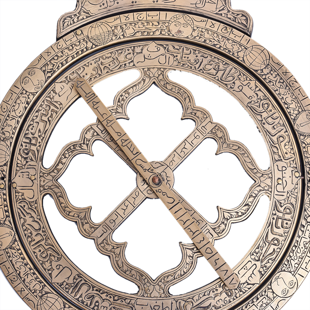 Brass ring dial from the mid - eighteenth century. This horological device was created by one of his generation's greatest designers and manufacturers. The dial is made up of two rings, with the outer ring containing a bridging bar. The outer ring, which depicts a circle encompassing the North and South celestial poles, is known as the meridian ring. Islamic carvings are carved into the rotating bridging bar. Between the bridge's bars is a slider with a pinhole that serves as the shadow mark. Nice décor item that is ideal for gifts.