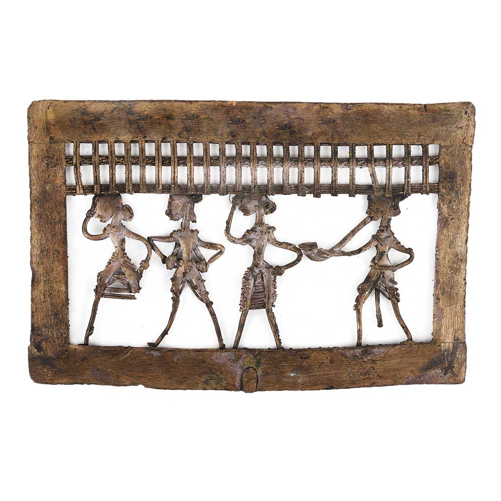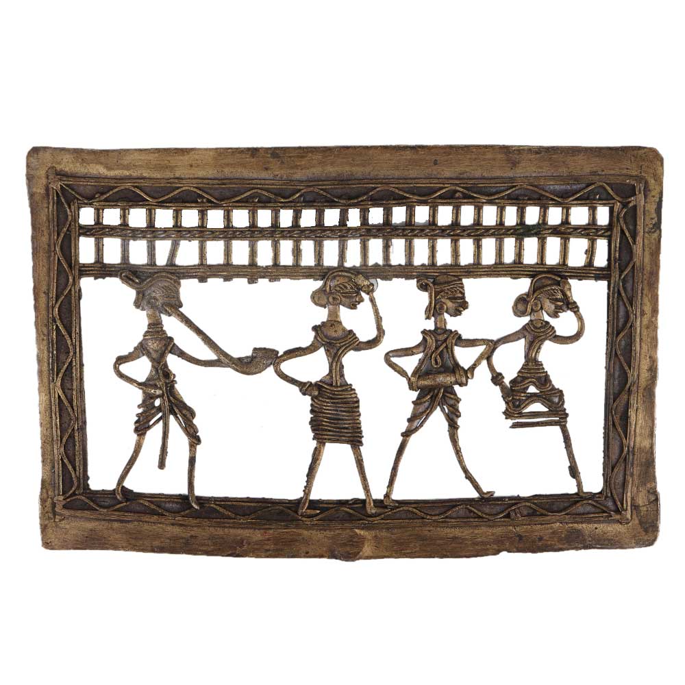 Ethnic and traditionally made rectangular brass dhokra wall art hanging depicting a dance troupe with two male musicians and two female dancers. This art shows the brass figurines made in wired form and has a lovely engraved border to add a finishing touch to the hanging. Home decoration, office, restaurants, hotel decoration, showpiece or souvenir.