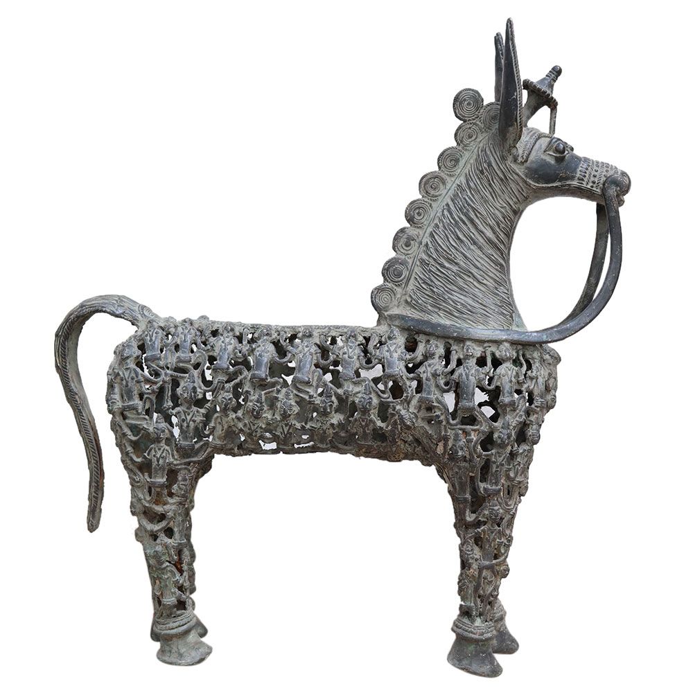 The magnificent brass work creation stands out for its elaborate craftsmanship and attention to detail. The talented artisan's artistic vision is on display through the combination of several deities combining to create the shape of a horse. Other representation of the Horse animal, as well as the other Gods forming the body, add a touch of religious significance and mysticism to this brass masterpiece.