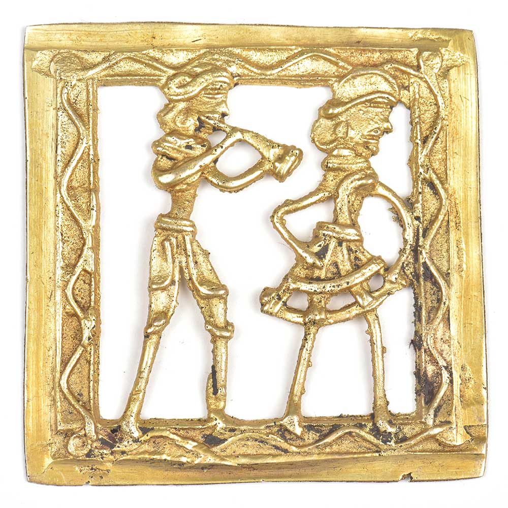 A beautiful tribal Wall hanging that shows a musician with a Dancer made in brass metal with an engraved frame . These rustic and vintage finished frames depict the tribal culture of the east. Intricate folk motifs in the frames add a touch of primitive simplicity and enchanting ethnicity.