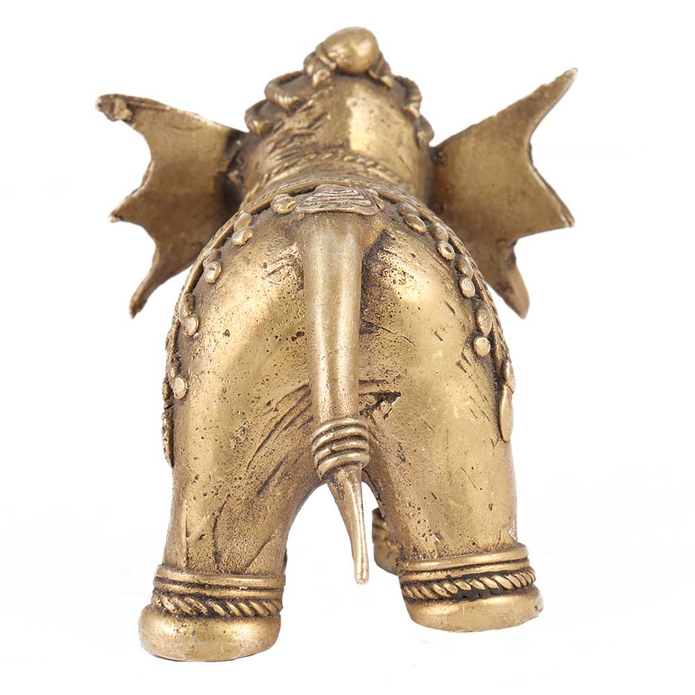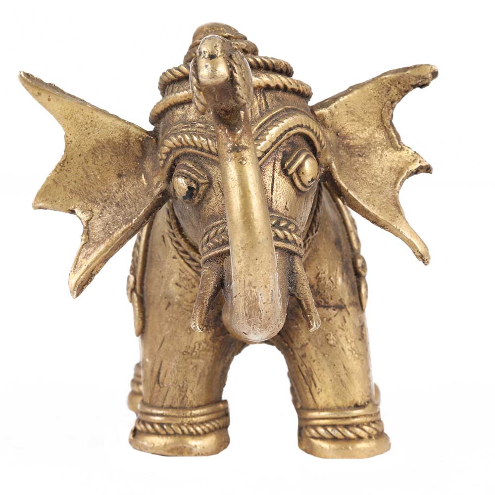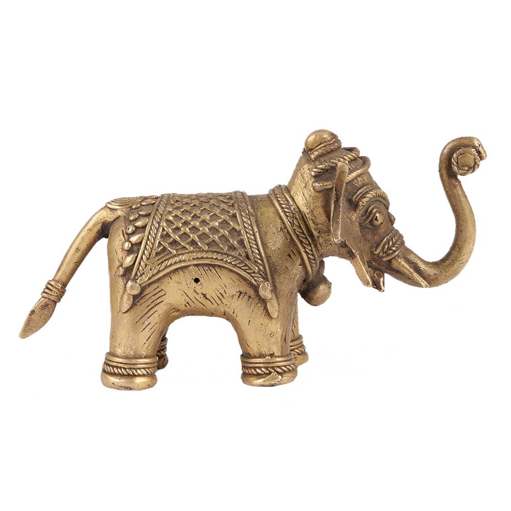 This elaborately carved brass elephant statue with trunk up has our signature antique gold  finish and is a perfect showpiece for the workplace or at home, and it can also be given as a gift.