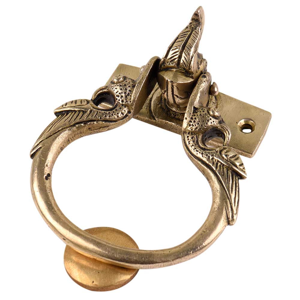 This brass door knocker is a traditional and elegant way to greet visitors to any home. This brass door knocker will age beautifully to become a lovely door adornment. This solid brass door knocker in the shape of an elephant head with peacock figurines on the ring will look lovely on the entrance door as well as other doors.