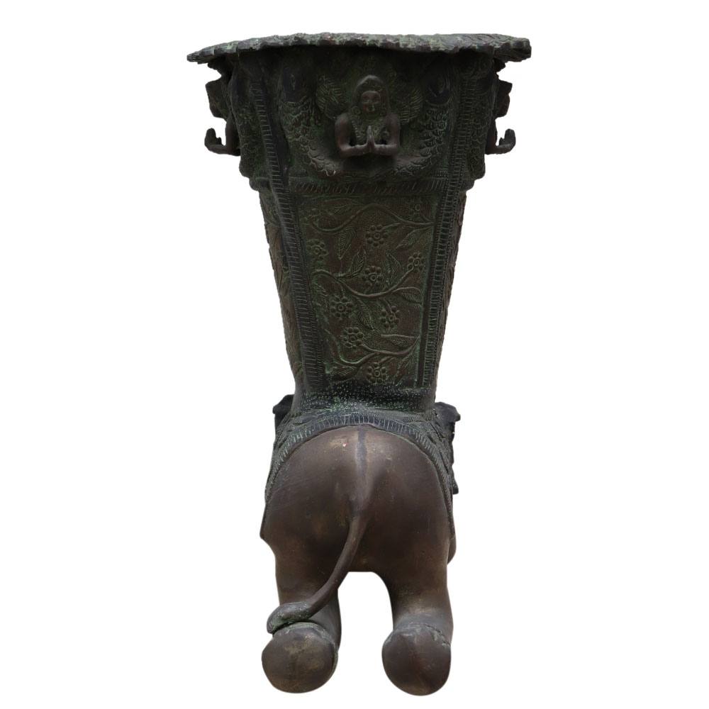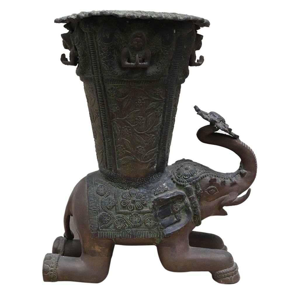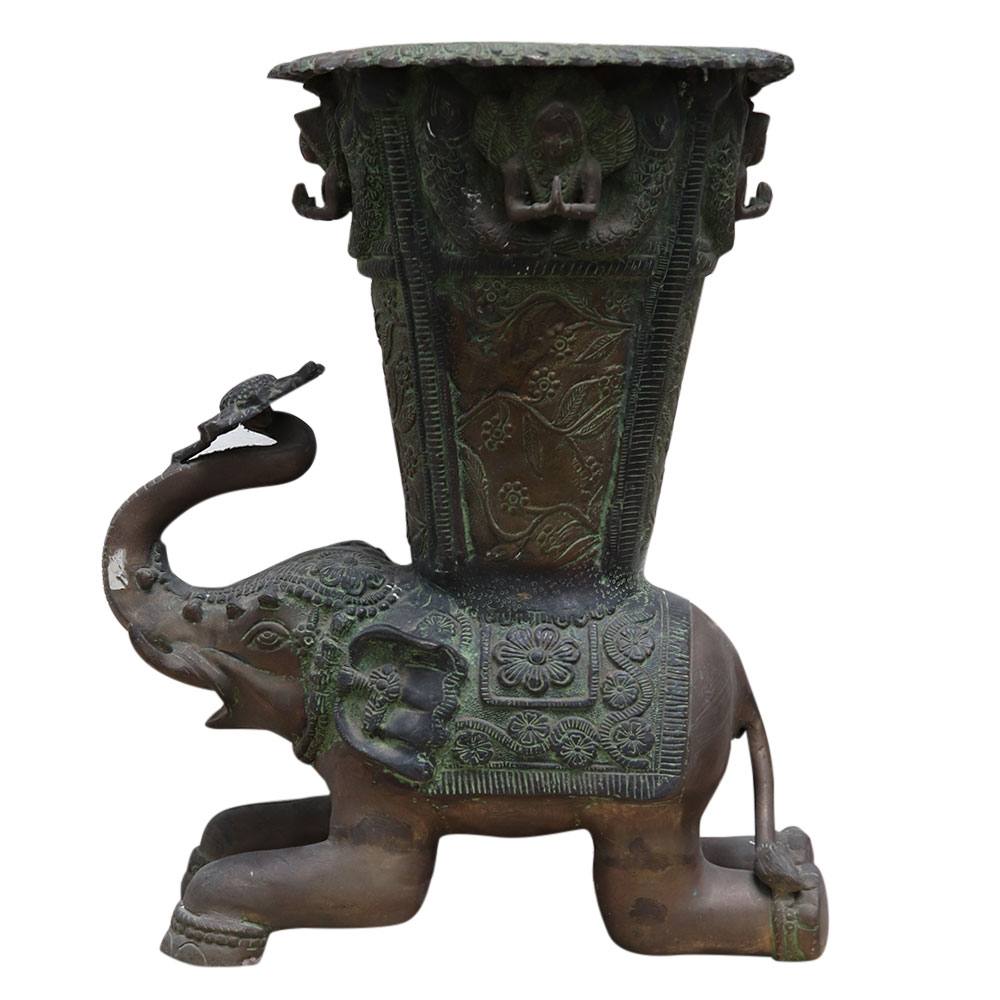 AÂ medium-sized Indian brass elephant from the 19th century that might have come from a temple. The artwork depicts an elephant with a vase on its back and a colourful robe covering its body. The vase contains floral designs, foliage motifs, and garlands on either side as design components. An excellent gift for friends and family.