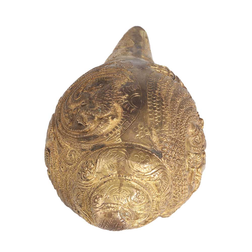 A conch shell made of high quality brass, engraved with Hindu God Lord Vishnu and Goddess Lakshmi and peacock. This conch is handmade by highly skilled and experienced Indian artisans using traditional methods. This shell has a golden finish that makes it eye-catching for your visitors and guests. Place this exquisite piece of art in your prayer room at home, office, restaurant, hotel, shop or cafe. With its antique finish and beautiful engravings, it will leave a long-lasting impression on your interior design. Use it at havan, rituals, prayers or auspicious occasions. An ideal gift for any special, festive and auspicious occasion for your friends, family and relatives.