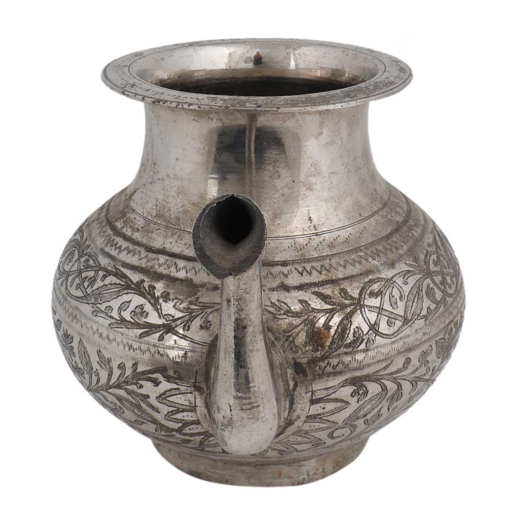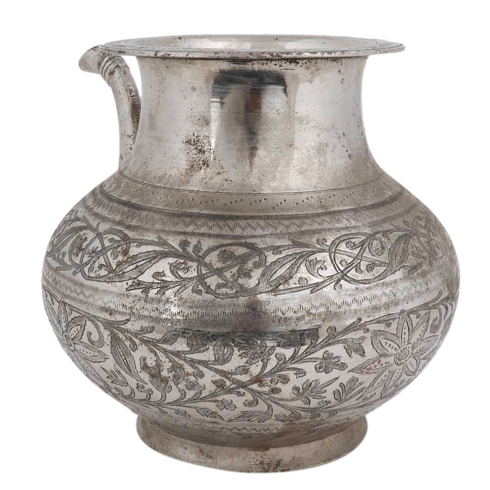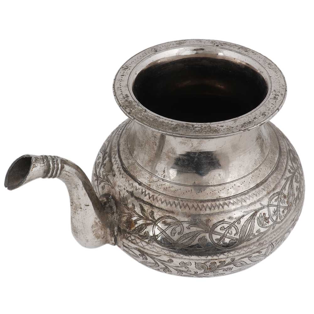 Brass Engraved Floral Design Water Pot With Spout. This brass pot has a bulbous body used in temples and other religious places . It has a bottom rim for support an has a large belly to store water with a spout that is attached to one side of the pot. It comes with a silver finish.