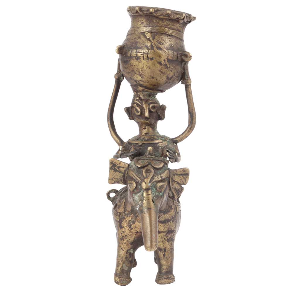 Handmade Female brass statue on a elephant with a big pot held by the lady used as a candle holder. These statues show the day to day life activities of tribal people . It is used as a collectors item or a great gift for your friends and relatives who have an eye for art.