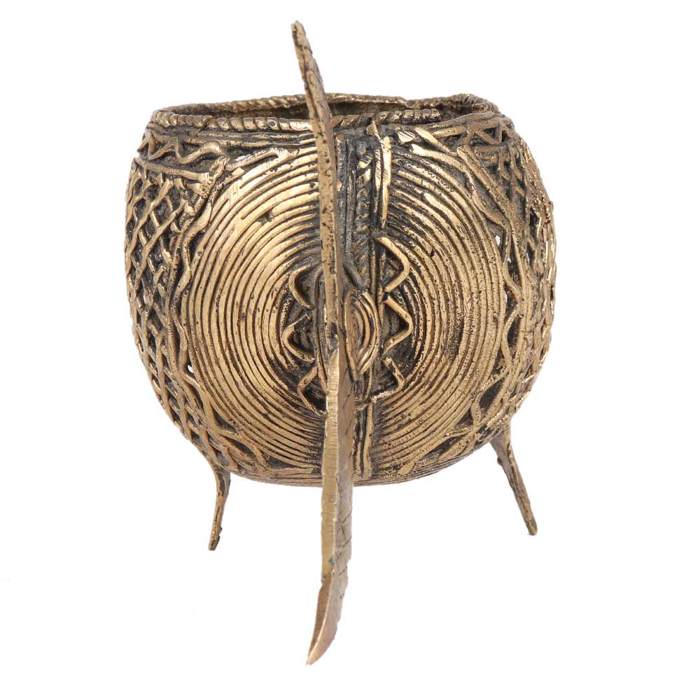 This Brass Pen Holder 'Golden Fish' in jali form the tribal Dokra collection is a stationery item that includes a pen-stand in the style of a fish that is fashioned in brass and has three legs for support. This Dokra art gorgeous fish shaped pen stand is a must-have piece of craftsmanship to add regional warmth to your table design, an attractive display, and an excellent gift for your family members.