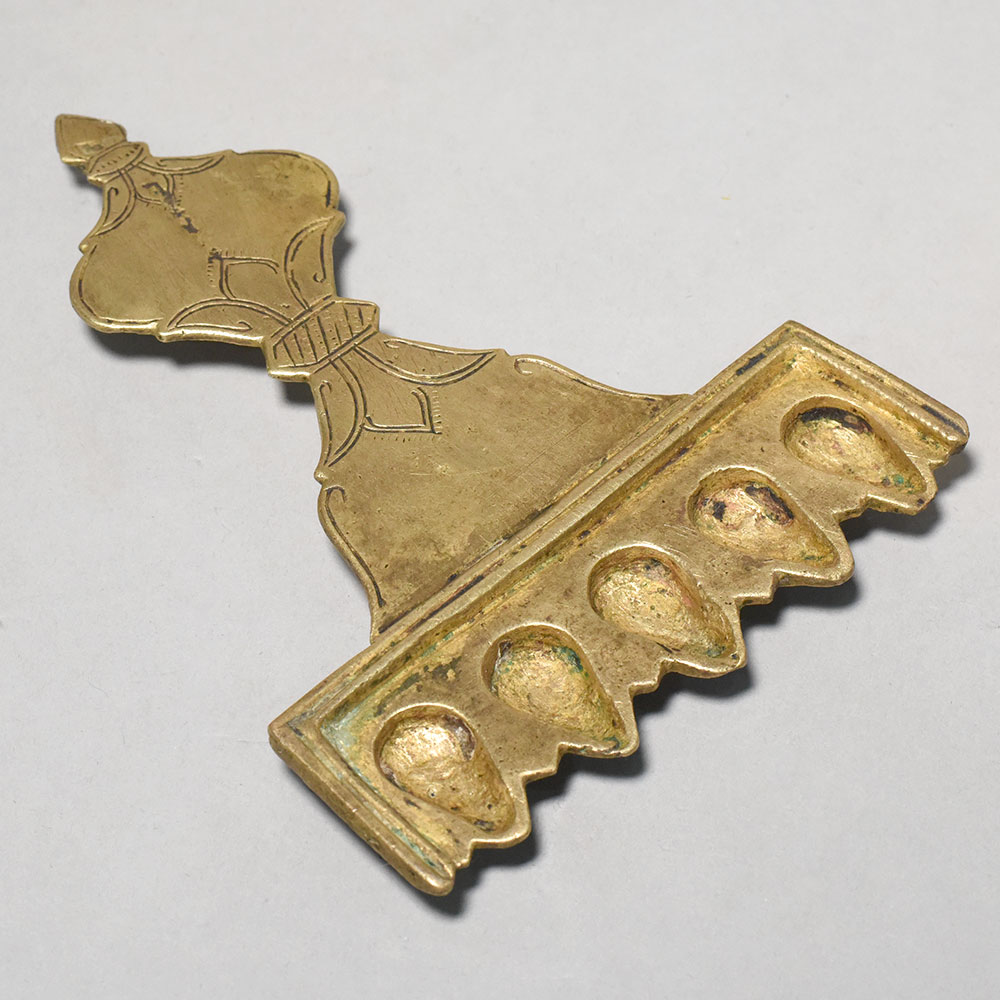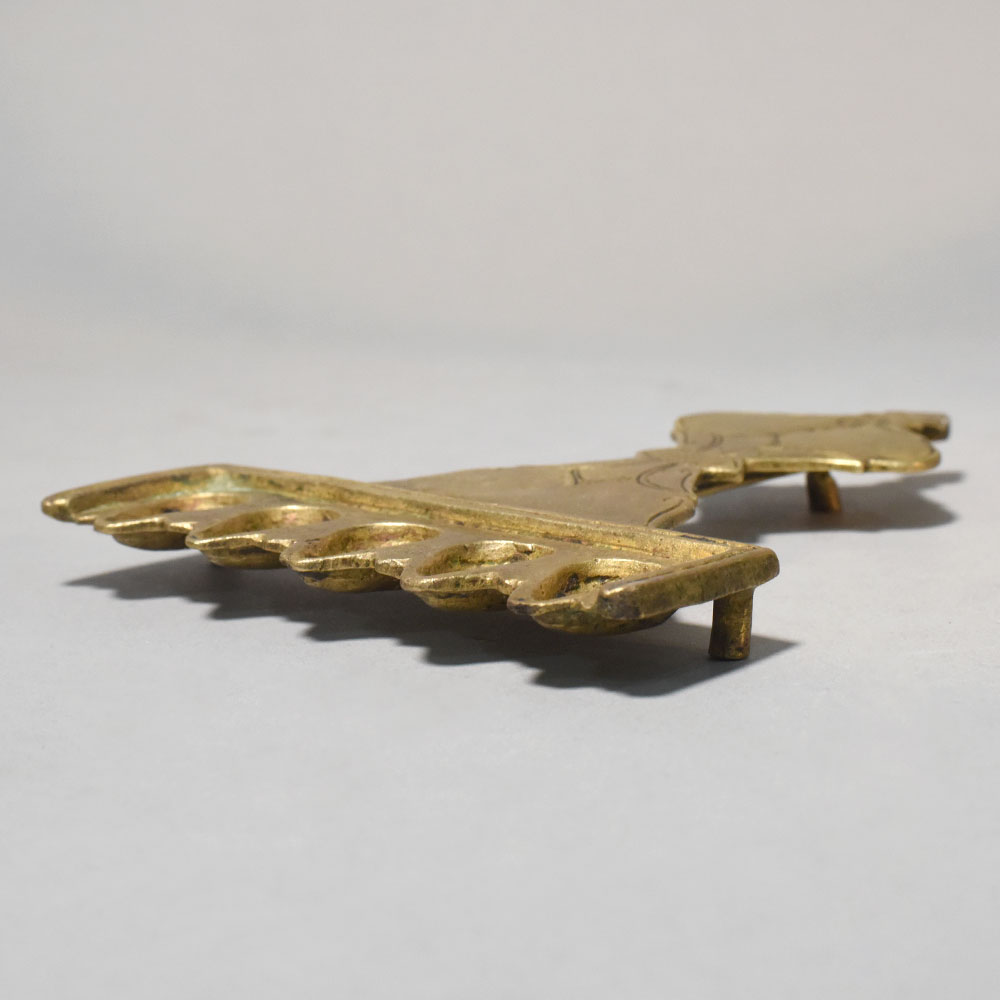 This brass five wick aarti lamp with handle is a traditional ritual lighting instrument used in Hindu worship and temple ceremonies. The lamp features five small oil cavities arranged in a row, designed to hold cotton wicks soaked in oil or ghee. When lit, the five flames create a bright and symbolic offering of light during aarti rituals. The elongated handle is decorated with simple engraved patterns and provides a firm grip while performing aarti. During the ritual, the lamp is gently rotated in circular motions before the deity, representing devotion, gratitude, and the offering of divine light. The five-wick design, also known as Panchmukhi, holds spiritual significance in Hindu tradition. It is often associated with the five sacred elements of nature and symbolizes balance, harmony, and spiritual illumination. Such lamps are commonly used in temples and household prayer rooms during daily pooja and special religious occasions. Made from solid brass, the lamp has a warm golden finish and a sturdy structure suitable for repeated ritual use. The small supporting legs beneath the wick holder help keep the lamp stable when placed on a surface. Ideal for home temples, pooja rituals, festive ceremonies, and spiritual practices, this brass aarti lamp reflects the timeless traditions of devotional worship.