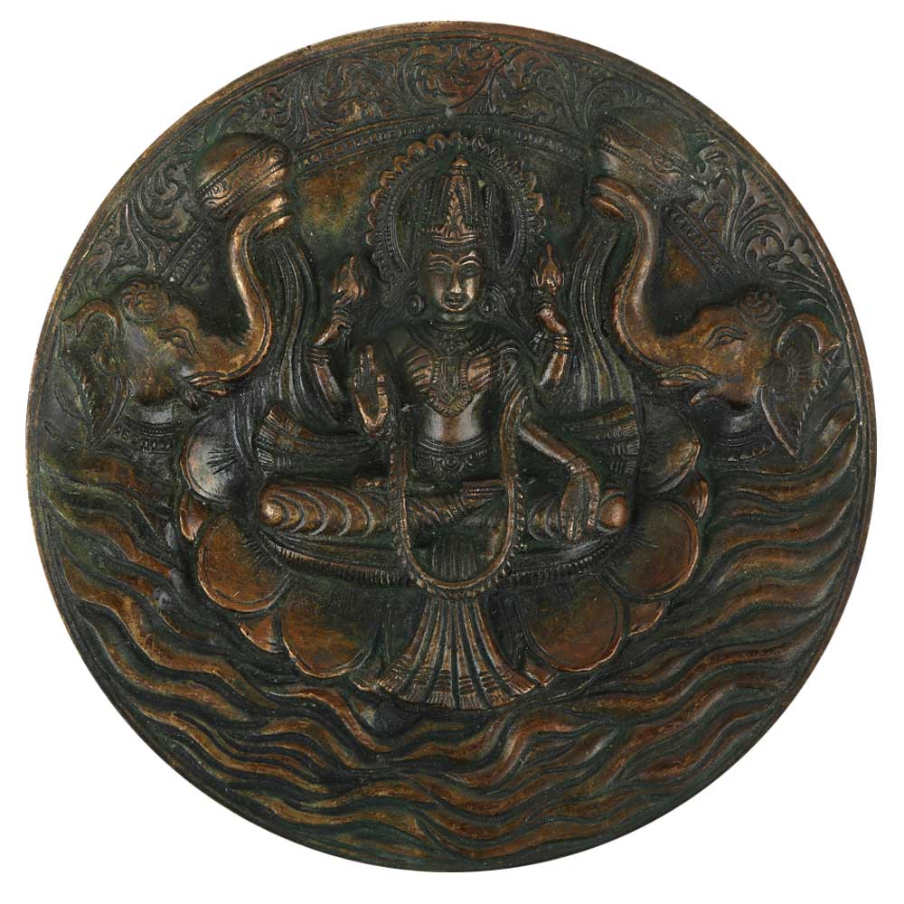 Handmade Brass Plate Embossed with Goddess Laxmi in the Center Sitting on a Lotus Flower with Two Elephants in the Background. This Image is Also Known as Gajalaxmi. This Brass Plate Serves as a Great Decorative Item a Gift or a Wall Hanging. Wedding gift, Diwali gift and house warming gift.