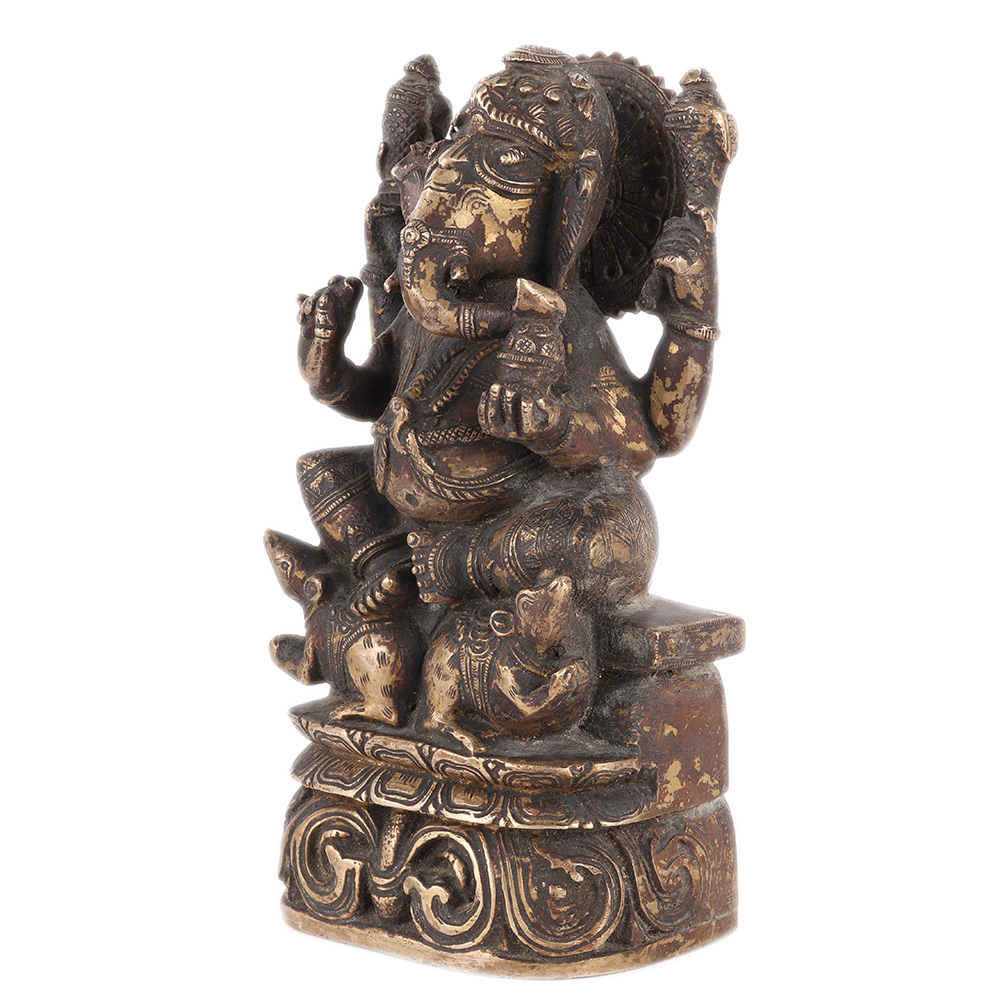 This Lord Ganesha statue is constructed in the traditional manner and is a reverent idol to use for your sacrifices. Ideal for a home mandir or workplace. The trunk on the left side, touching modak and moosak, is thought to be particularly lucky.
