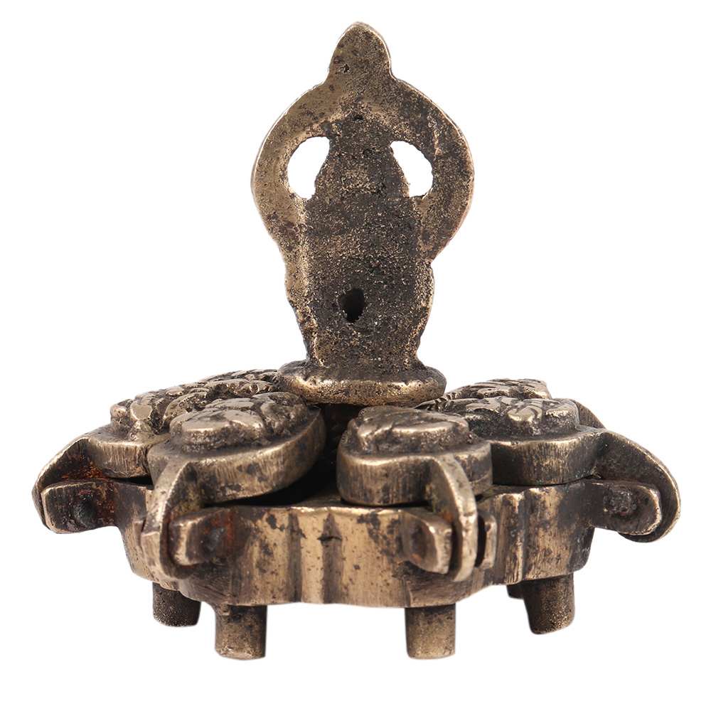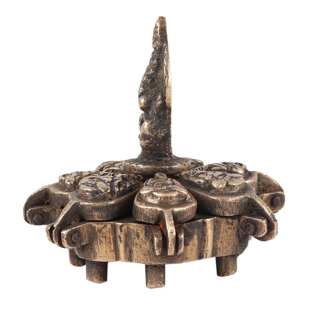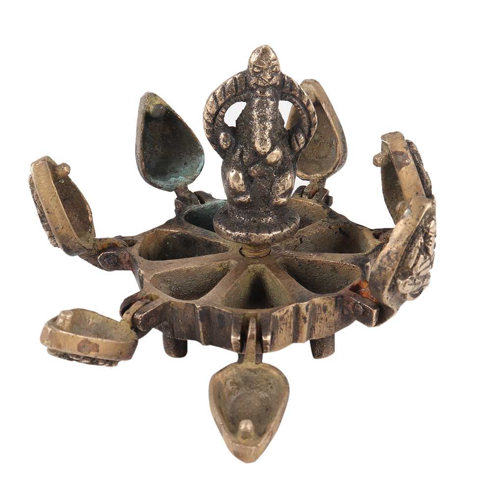 The Tikka Box is a traditional Indian ritualistic form of storage made of excellent solid brass. Previously, the seven independent pockets were used to store spices or bright powders for face and hands cosmetics. The seven compartments are released by loosening the central Ganpati, which serves as a crown. Each chamber lid is pivoted independently and can be opened by removing the top.
