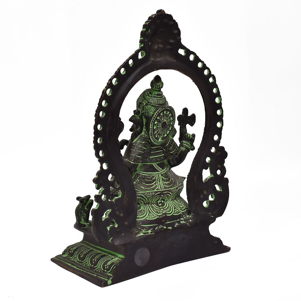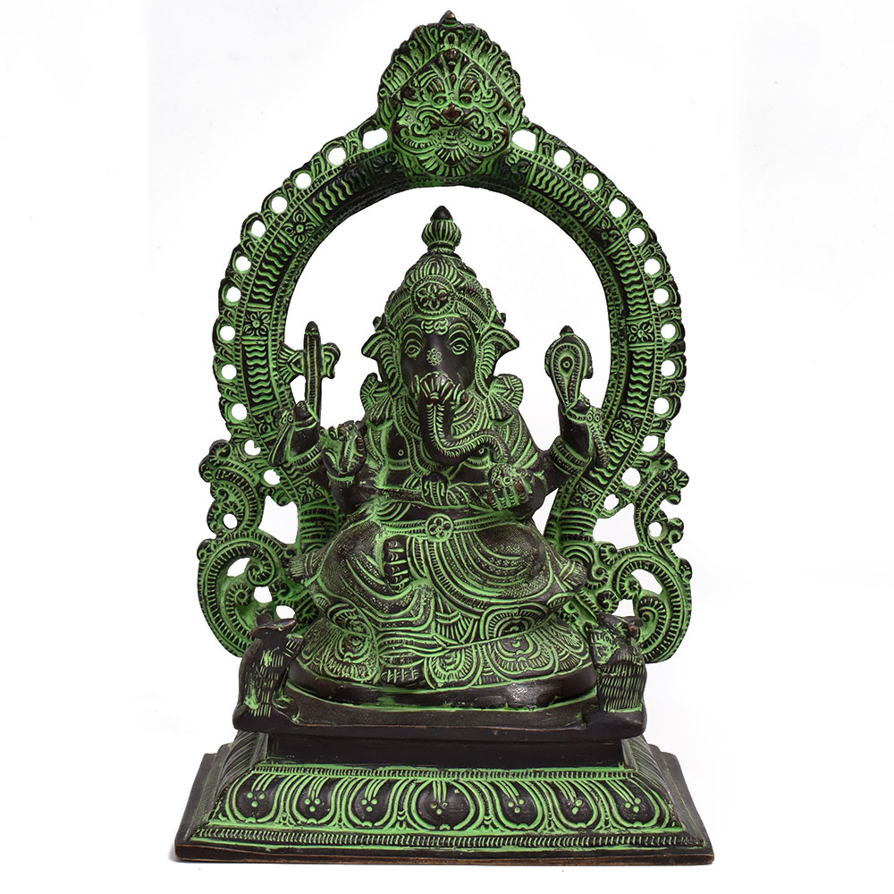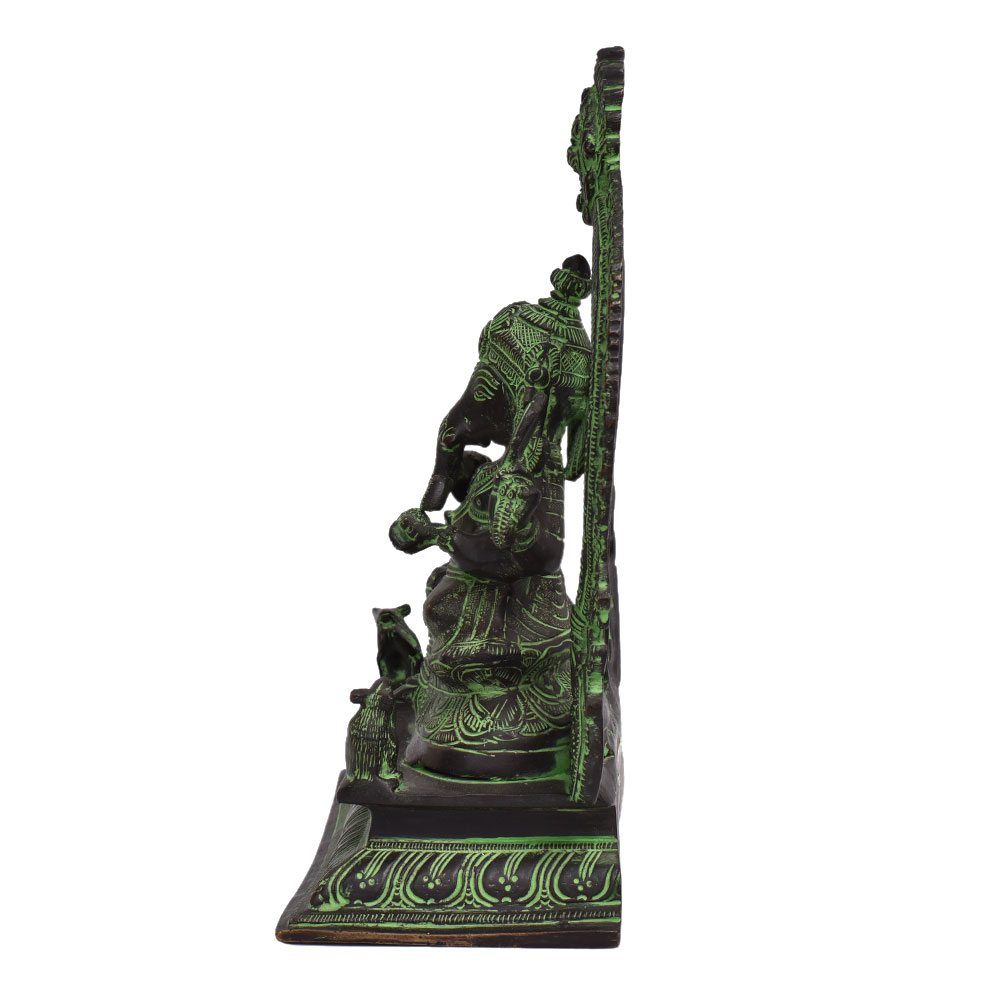 This Ganpati statue in a seated pose is a showpiece for your home temple. This will improve the appearance of your home. This lovely showpiece will entice your guests. Put it in your living area, visitor room, dining hall, or centre table. This Ganesha showpiece is nicely crafted and finished in a green brass antique finish with a cute and appealing design.