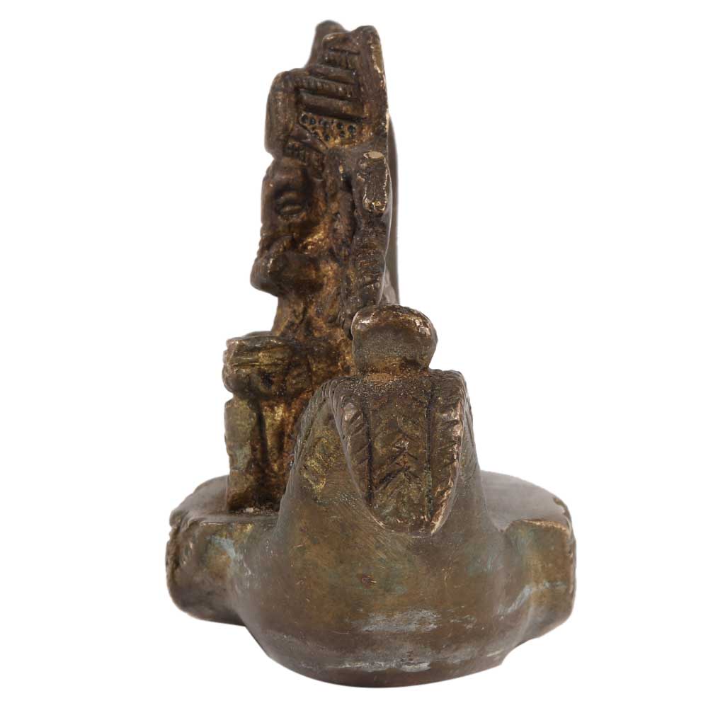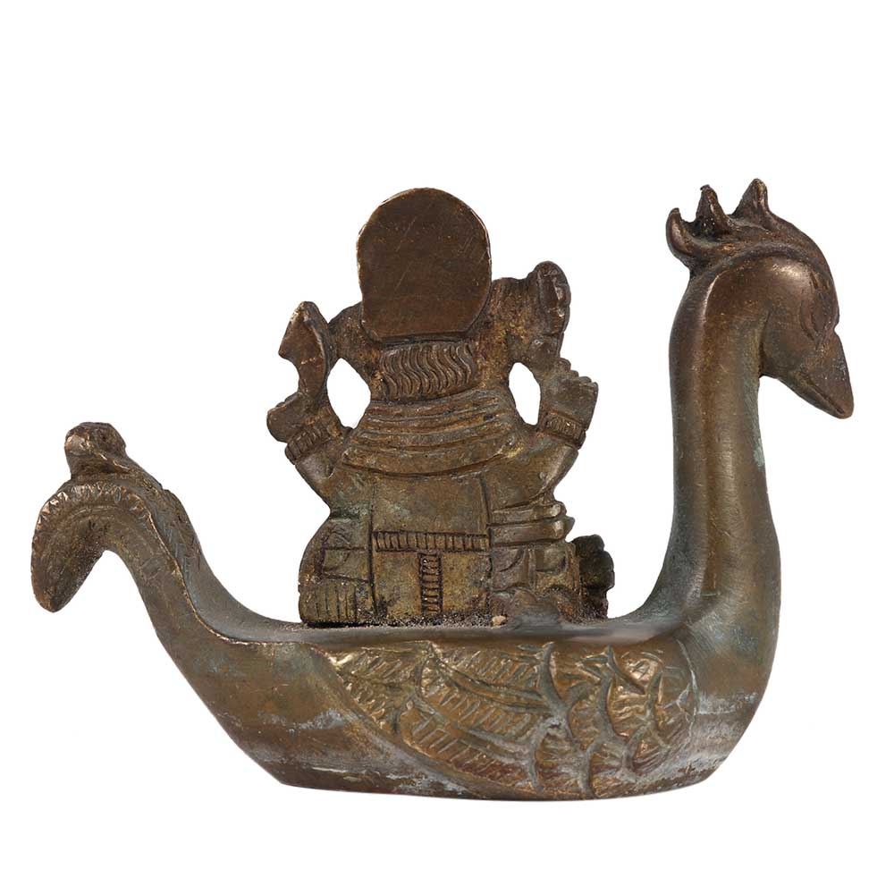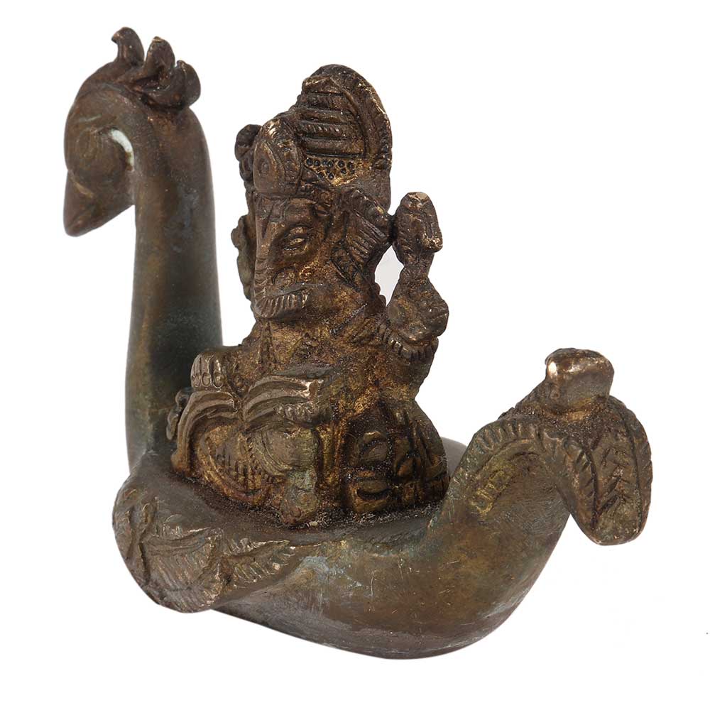 This lovely statue of lord Ganesha sitting on peacock boat and writing a book is constructed of brass. It features richly detailed hand sculpting by highly talented craftspeople. A fantastic gift for inauguration, corporate gifts, homecoming gifts, and festivities, among other occasions.