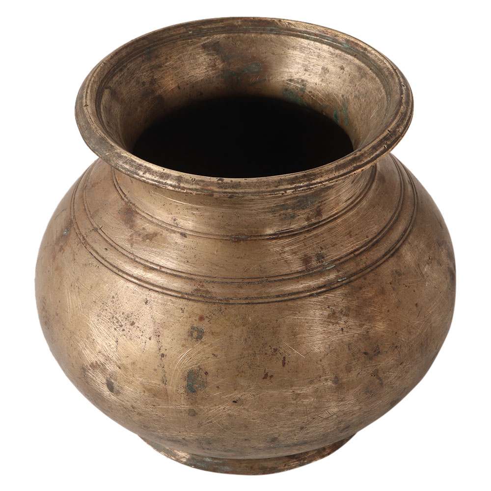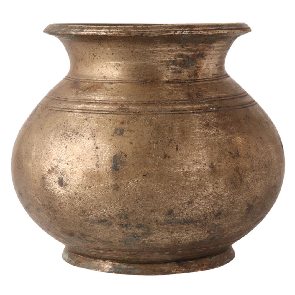 The brass Gangajal water lota comes with a large belly. It has lines on its neck. It is believed that the earth contains positive energy that passes into the brass and then into the water it holds. It is considered an auspicious vessel for hindu rituals.