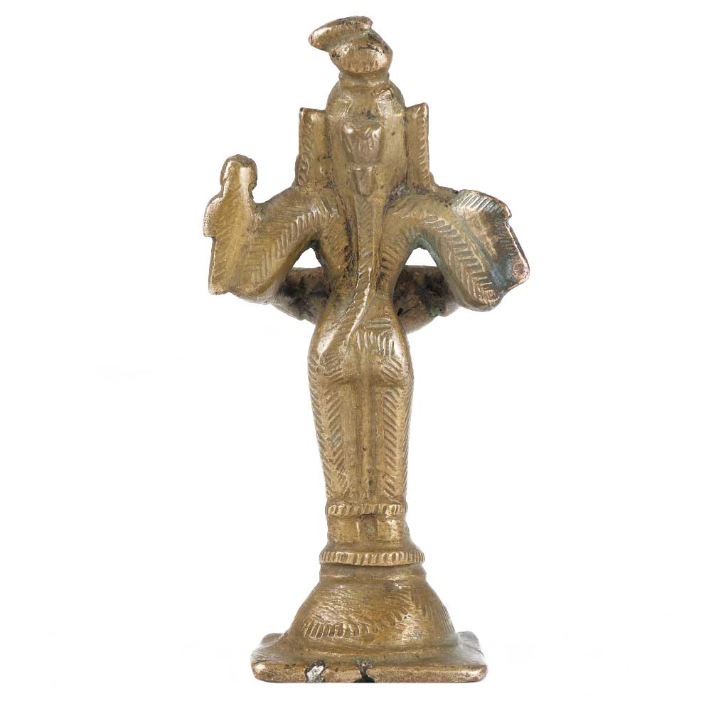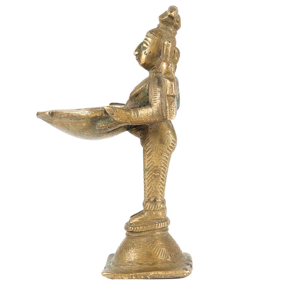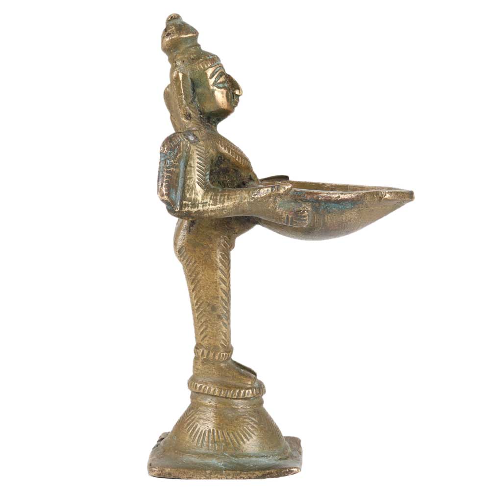 A beautifully crafted brass statue of Lakshmi, the deity of riches, prosperity holding an oil lamp in her hands and a parrot on her right shoulder. Although this sort of diya is commonly linked with Lakshmi, the parrot on her shoulder may indicate that the figure is Meenakshi, the deity of the picturesque Temple Complex in Madurai, Tamil Nadu, Southern India. The hairstyle, worn in a long high ponytail at the back, appears to prove this.