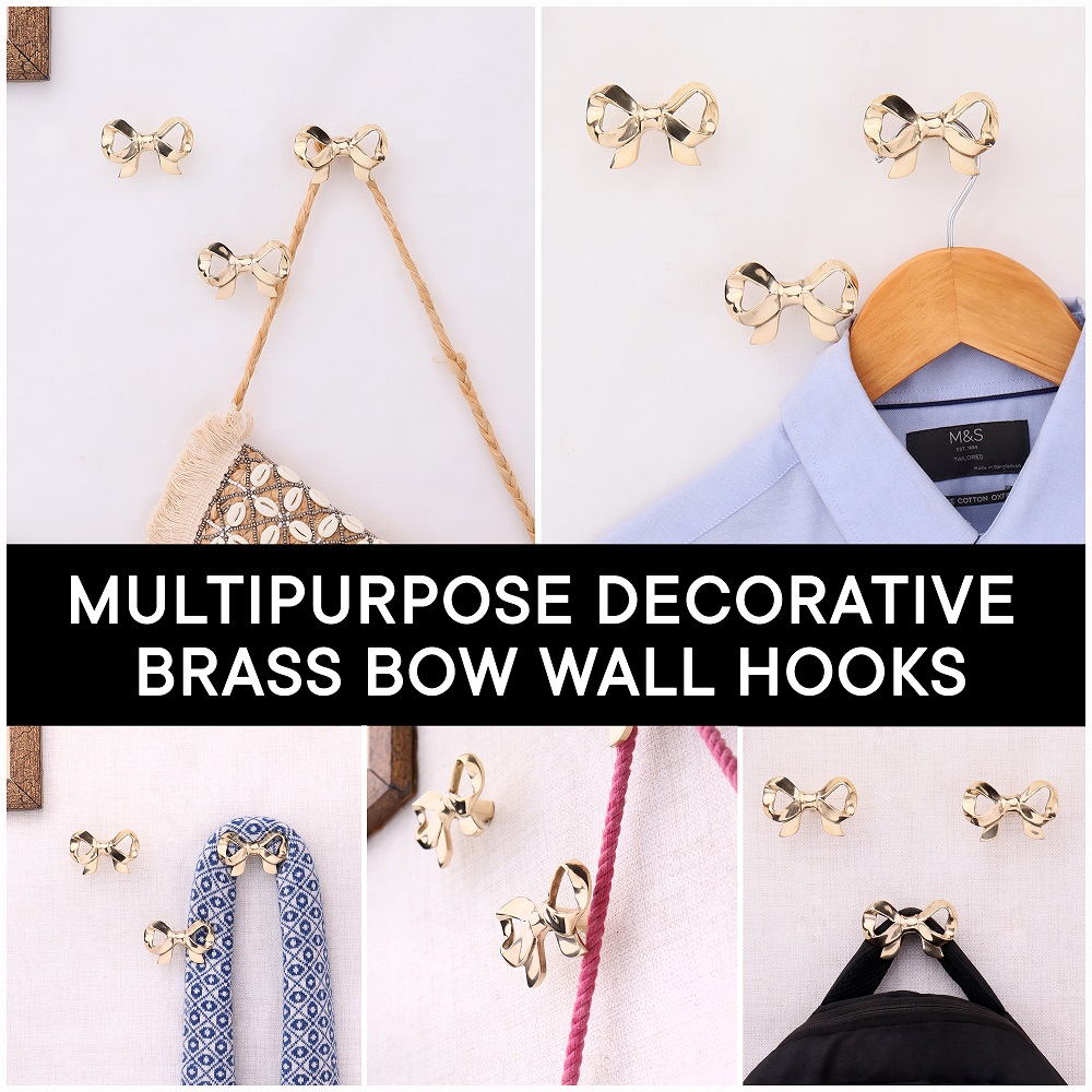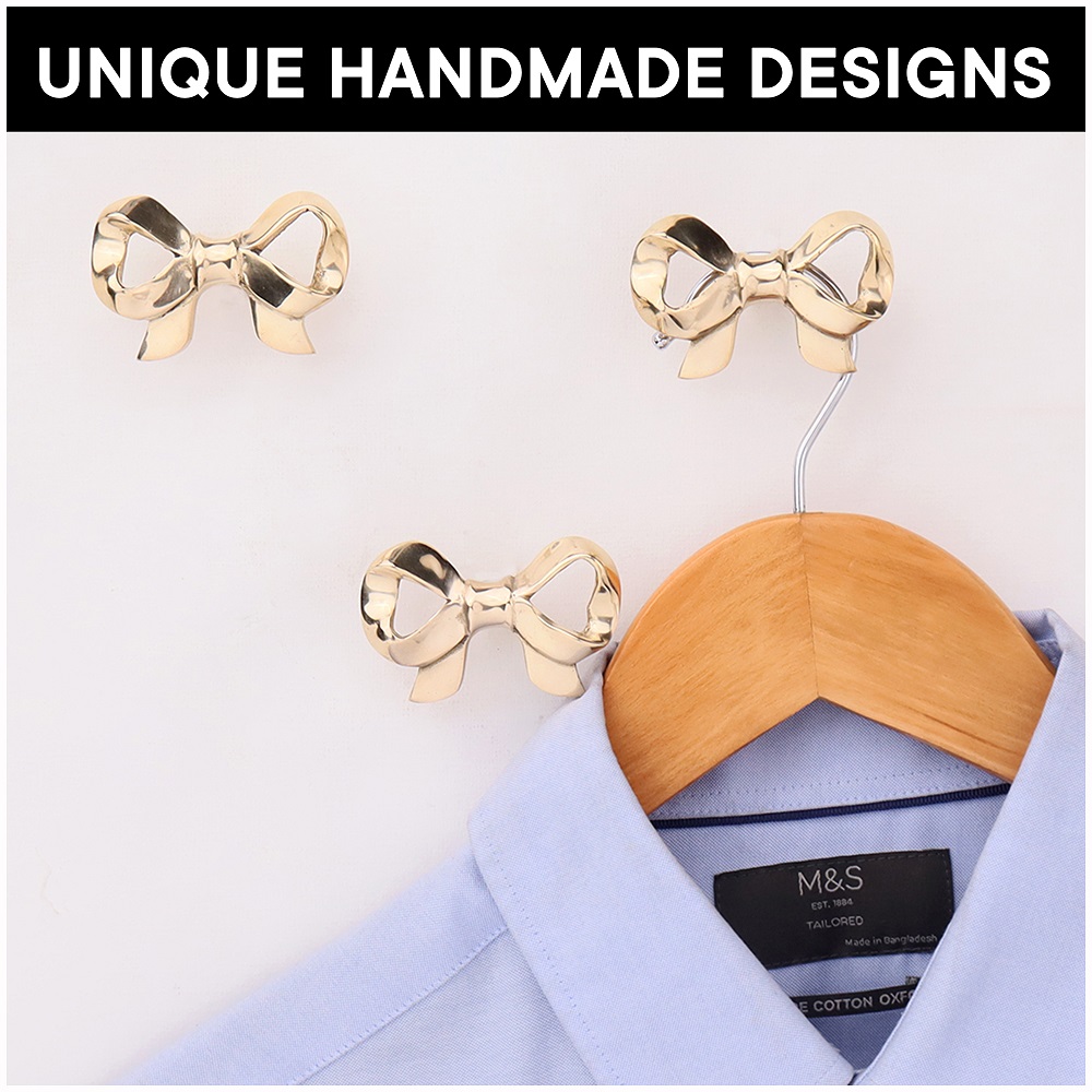 Add a touch of charm and utility to your space with the Brass Gold Bow Wall Mounted Coat Hooks – Pack of 3. Expertly handcrafted from solid brass, these hooks feature a delicate bow design finished in radiant gold. Created to bring both beauty and purpose into your home, each hook serves as a stylish accent that doubles as a reliable spot for your coats, scarves, or accessories. These brass bow wall hooks are perfect for those who love refined details and long-lasting decor.