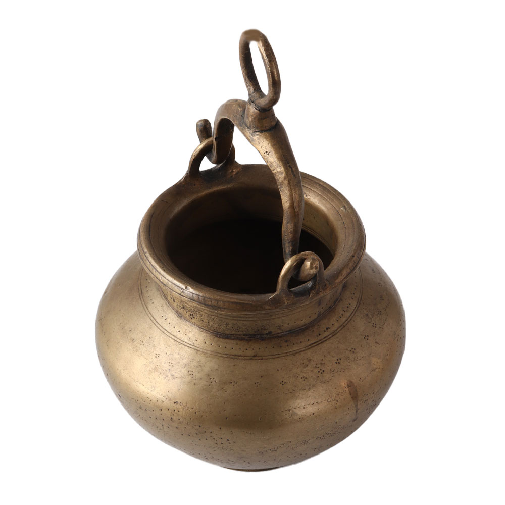This vintage brass planter features a handle made of brass that is mounted on two sides and connected to a brass yolk. This pot has seen a lot of usage and affection. hanging from a pot rack in the kitchen or at home on a patio. This ornamental vintage brass pot will look wonderful as a flower pot, shelf adornment, or table display.