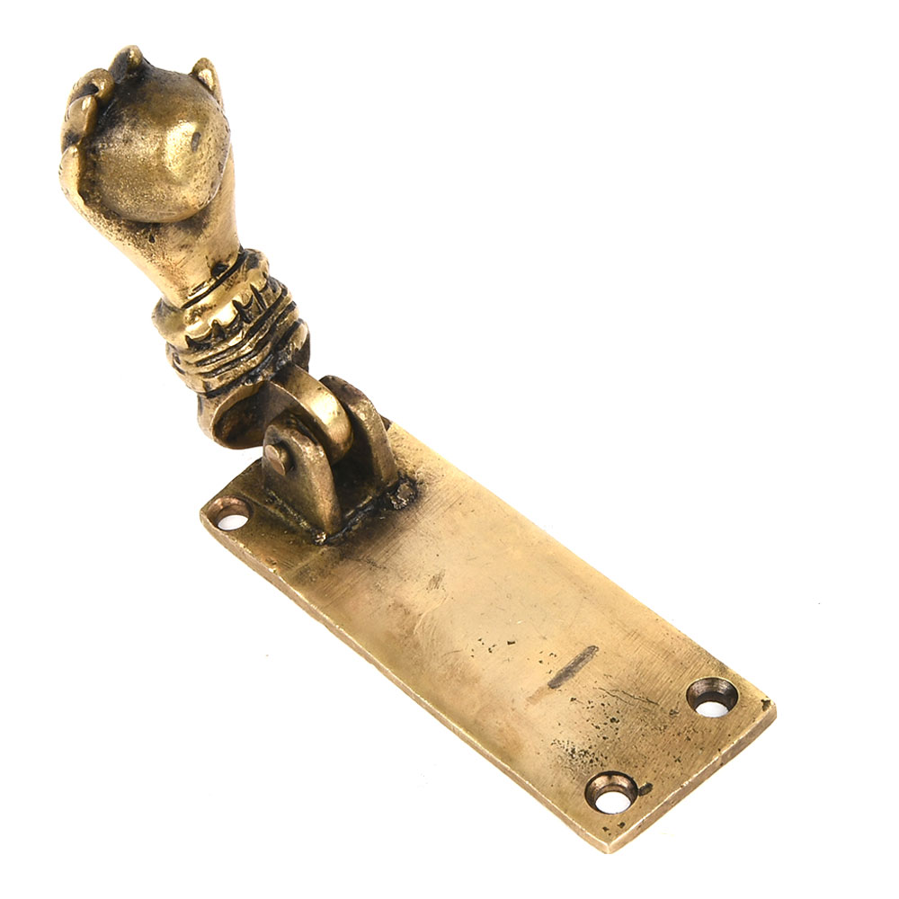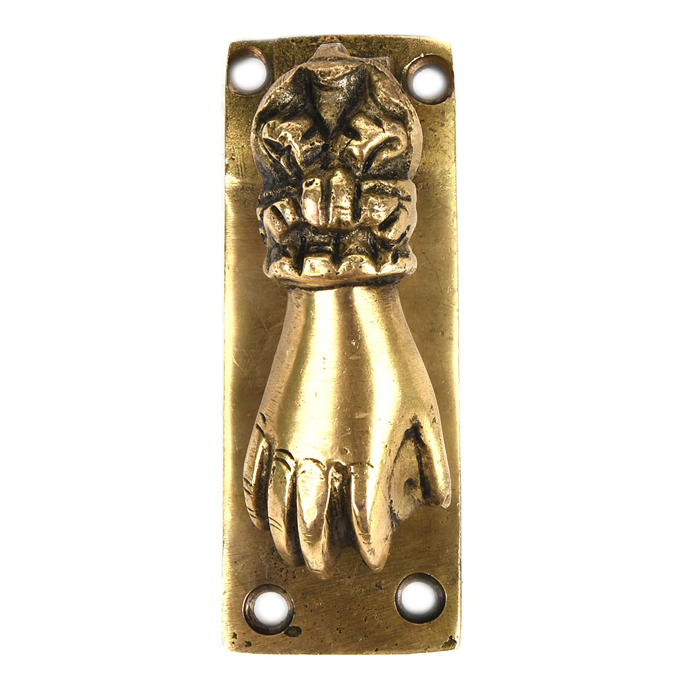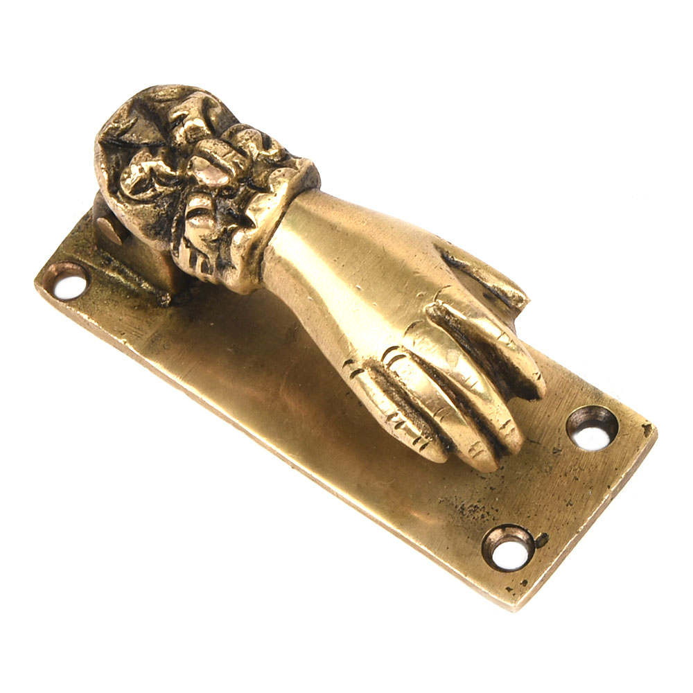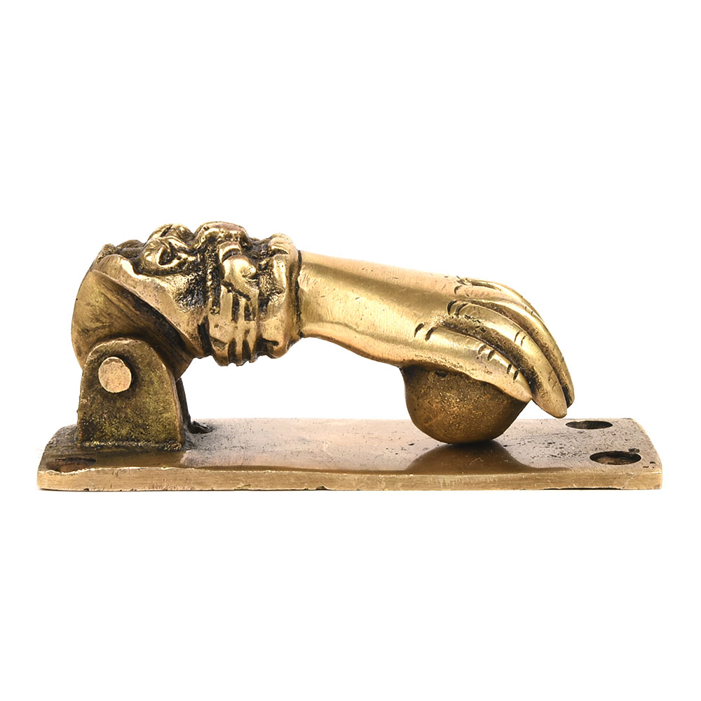 A great way to add a Victorian feel to your doorstep. The visitor lifts the hand that pivots at the wrist, and the ball held by the hand strikes a plate attached to the door.