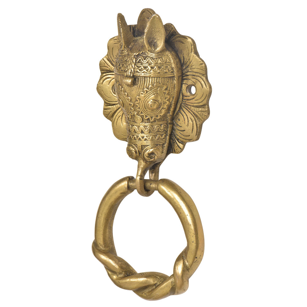 A wonderful handmade brass door knocker with horse head engraved by tribal artisans that is visible in the design. The design is elaborate with fine detailing on the eyes and near the mouth . It has a ring attached that acts as a knocker or as a towel ring in the kitchen or bathroom.