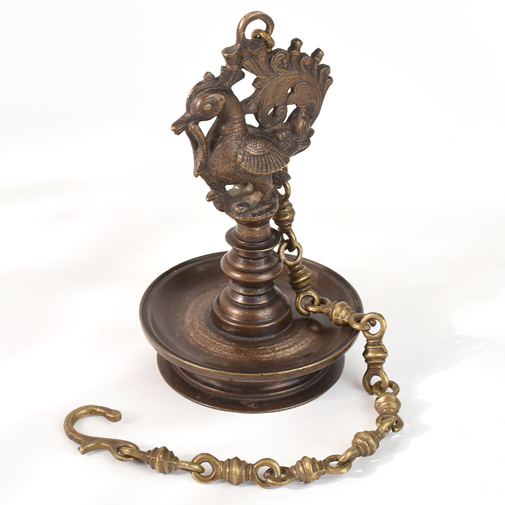 This is an intricately carved Annapakshi sculpture diya on a brass hanging villaku oil lamp. The lamp is typically found at the front door of most houses and serves as a welcome sign for all visitors. It's thought to live in heaven. The bird is typically shown holding a flowering vine in its beak, which represents abundance. During holidays and all puja / prayer ceremonies, it is important to light the diya or lamp to bring light, prosperity, and happiness to the entire family.
