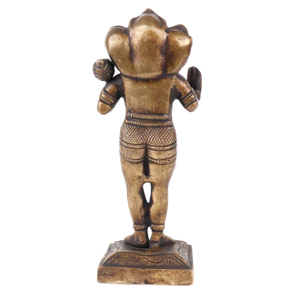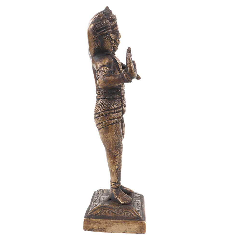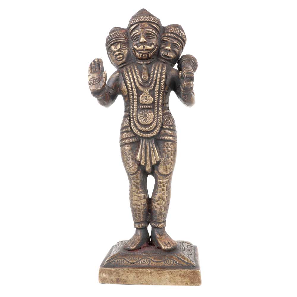 This rare bras handmade statue of standing with three heads one is lord hanuman himself and the other two are of narsimha and Varaha. In his hand he holds an enormous club which is the signature weapon of lord hanuman.