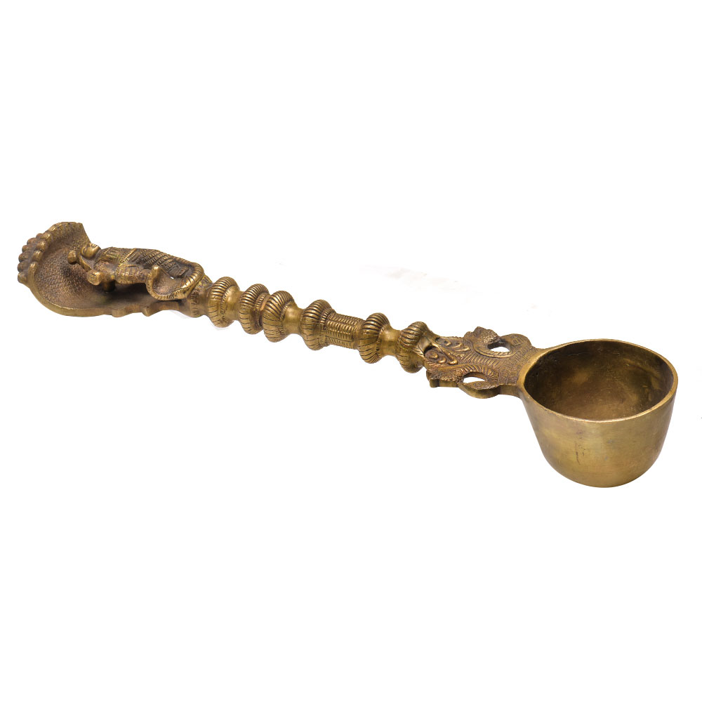 This is an intricately carved pooja spoon made of brass is used for offering worship during puja or havan . The spoon has a deep bowl to fill holy water or oil with a decorative finial and an abstract design on the top and bottom of the spoon . Use it as a home décor product or as a gifting option for family and friends.