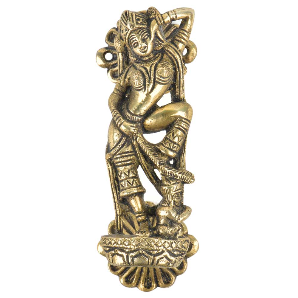Decorative Hindu goddess statue standing with one leg on the demon and traditional Design on the top and bottom of the door Handle is made by master craftsmen and artisans using superior quality brass . Ideal for Drawer, Dresser, Cabinet, Wardrobe, Cupboard and Almirah.