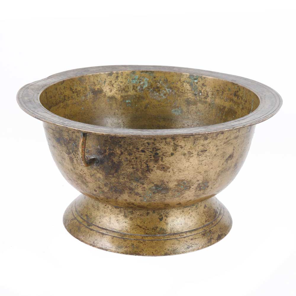 This antique style brass bowl has a protruding thick brass rim with a deep hollow and two ring handles. It can be used as a decorative as well as a centerpiece.