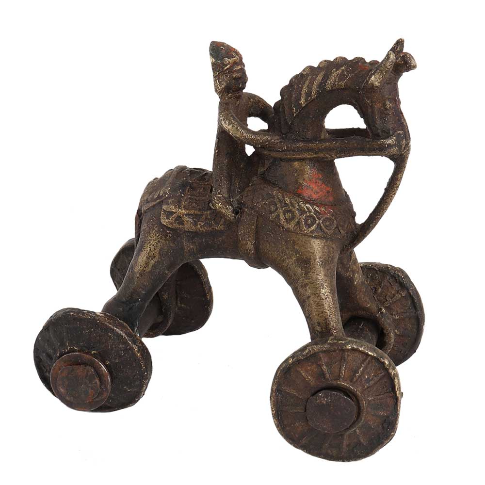 Brass Horse and Rider on Wheels East Indian Temple Toy was used to occupy children while their parents were in Temple. The Originals Were Mostly Made of Bronze with Ornate Saddle. Nicely detailed figurine of a Toy Horse on wheel also know as pull Toy was used as a Toy and now used as a Collectors Office, Home decoration and house warming gift.