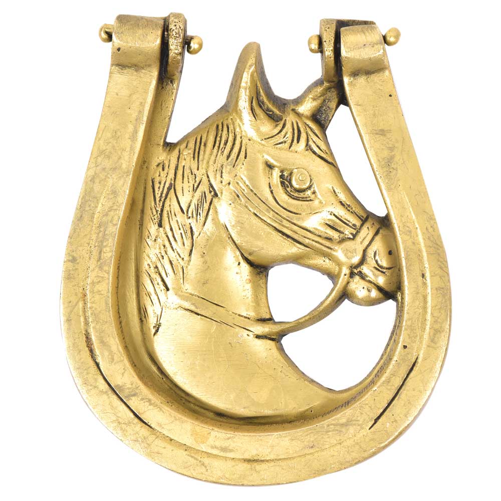 This beautifully handmade brass door Knocker has a horse face in between the horse shoe. The horse shoe was considered very auspicious by the cowboys and they use to nail it on the barn door for good luck and prosperity. Hang it on your main door for good luck and success.
