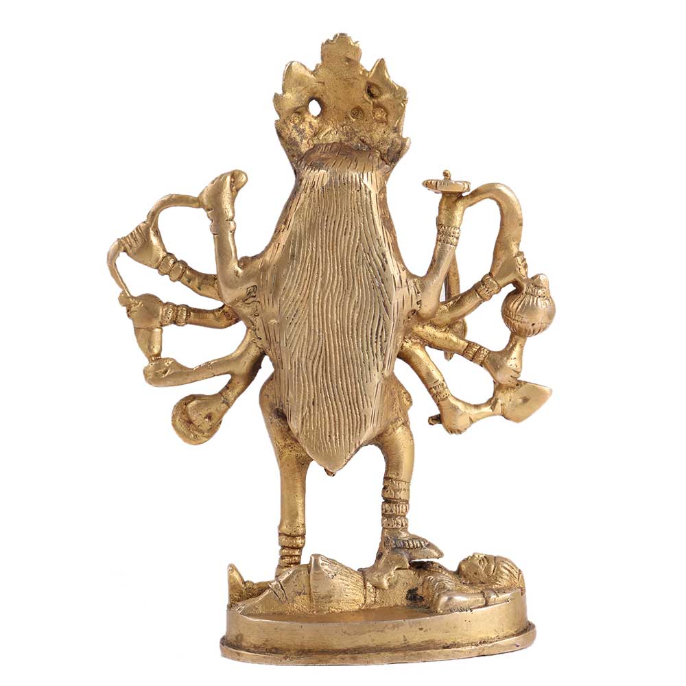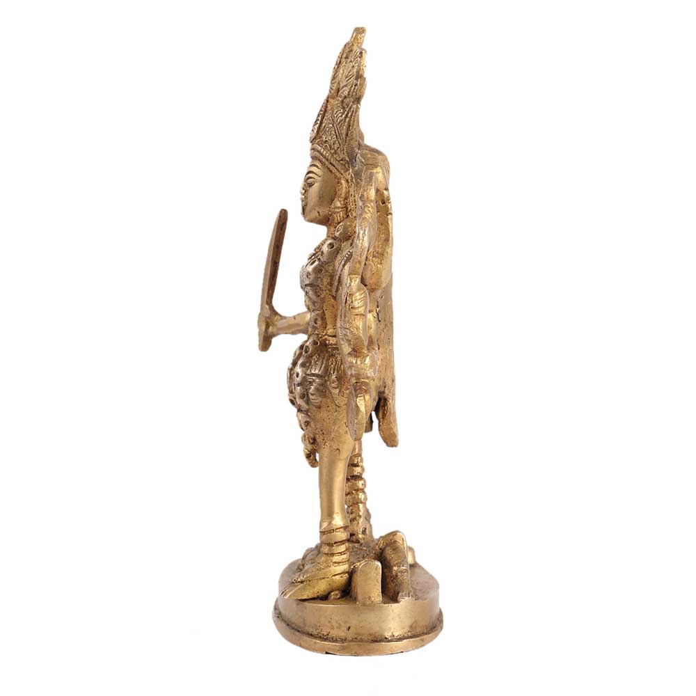 The name Kali is derived from the Sanskrit root word Kal, which means time. She is the most empathetic form of Devi because she gives her children moksha, or liberation. She is Shiva's polar opposite, the destroyer. They are the destroyers of illusion. This stunning brass Idol has a flawless finish and is incredibly beautiful. This Goddess Kali Idol by Divya Mantra looks divine and can be used in your puja room or gifted to family and friends.