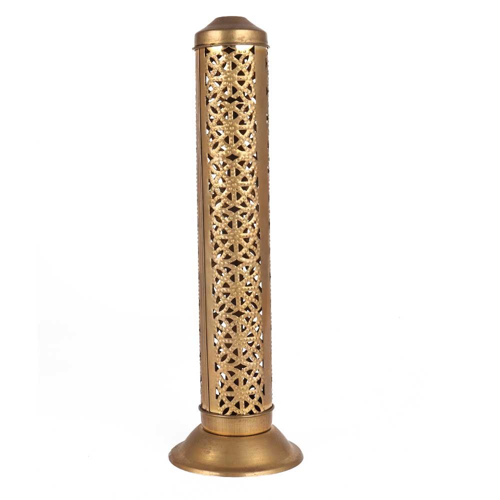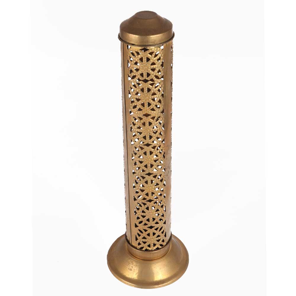 This brass incense holder with a long cylindrical shape and exquisite jali cut design  is suitable for usage in both homes and offices. It is completely safe to use and prevents burns in children. It comes with a separate ash collector to keep the puja house, room, and office clean. It can contain up to 5 sticks at a time.