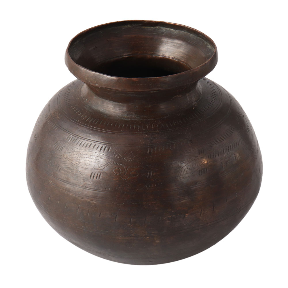 An old Indian brass pot from the 19th century with a protruding neck, a broad lip, and a huge belly. This metal water pot, which was created in India during the 19th century, catches our attention with its wide lines and attractively corroded, worn patina. The pitcher would look excellent displayed on a patio, in the yard, or on a strong table in any home. It features a wide belly that is topped with a flaring neck and protruding lip. This small Indian pot would bring exquisite appeal to your living room, dining area, or kitchen. It is frequently used in home temples or hindu temples. These things would be beneficial additions to your choice.