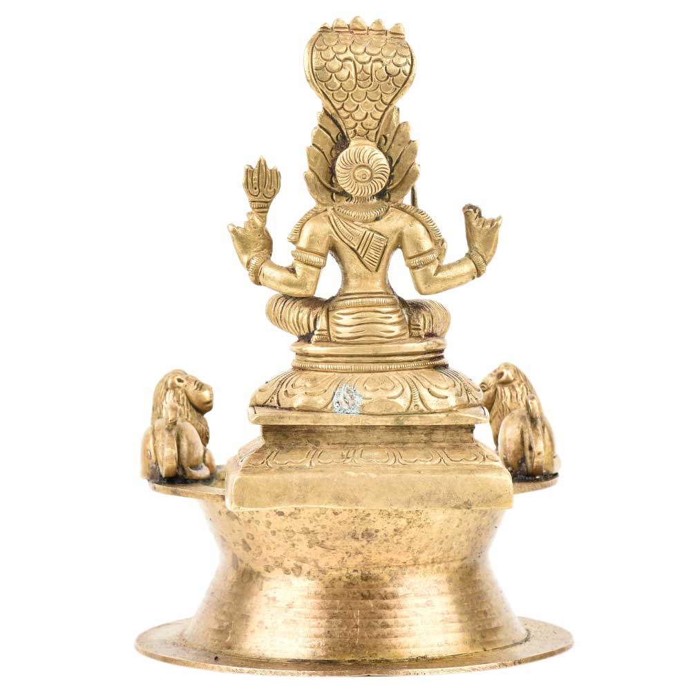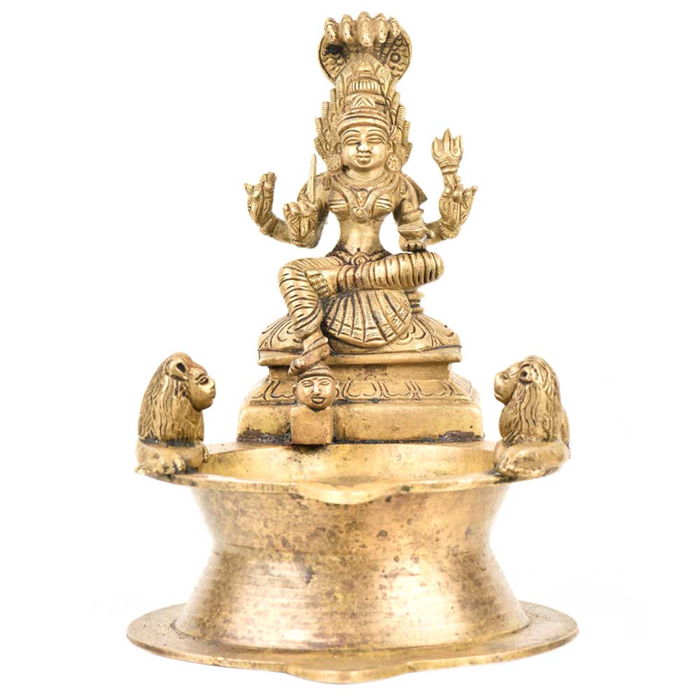 Handmade Brass oil lamp with goddess Mariammam with sheshnag and two lions is a very traditional lamp that adds spiritual flavour to your decor. Vegetable Oil, Mustard Oil or Desi Ghee can be Use to Light the Lamp with Cotton Wicks.