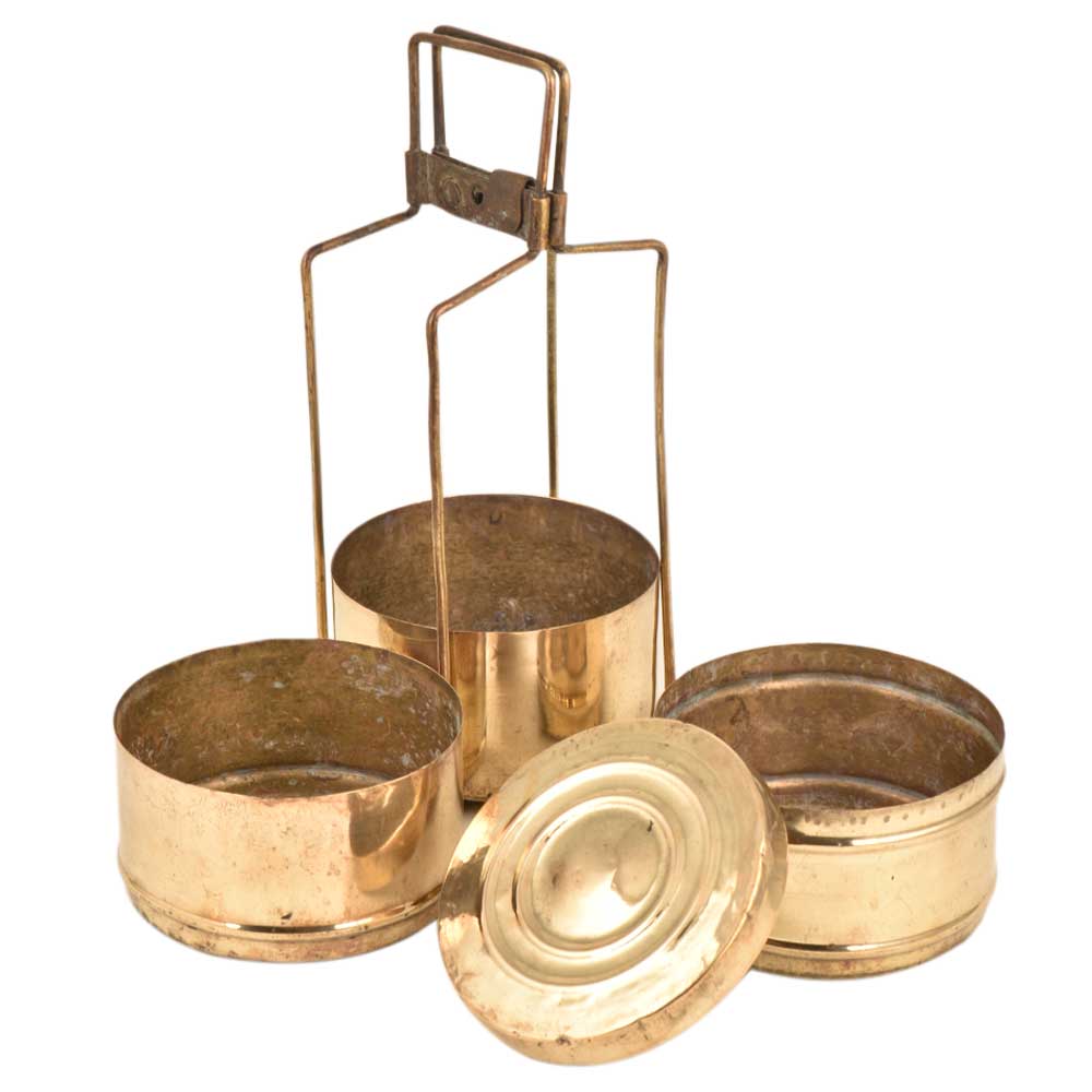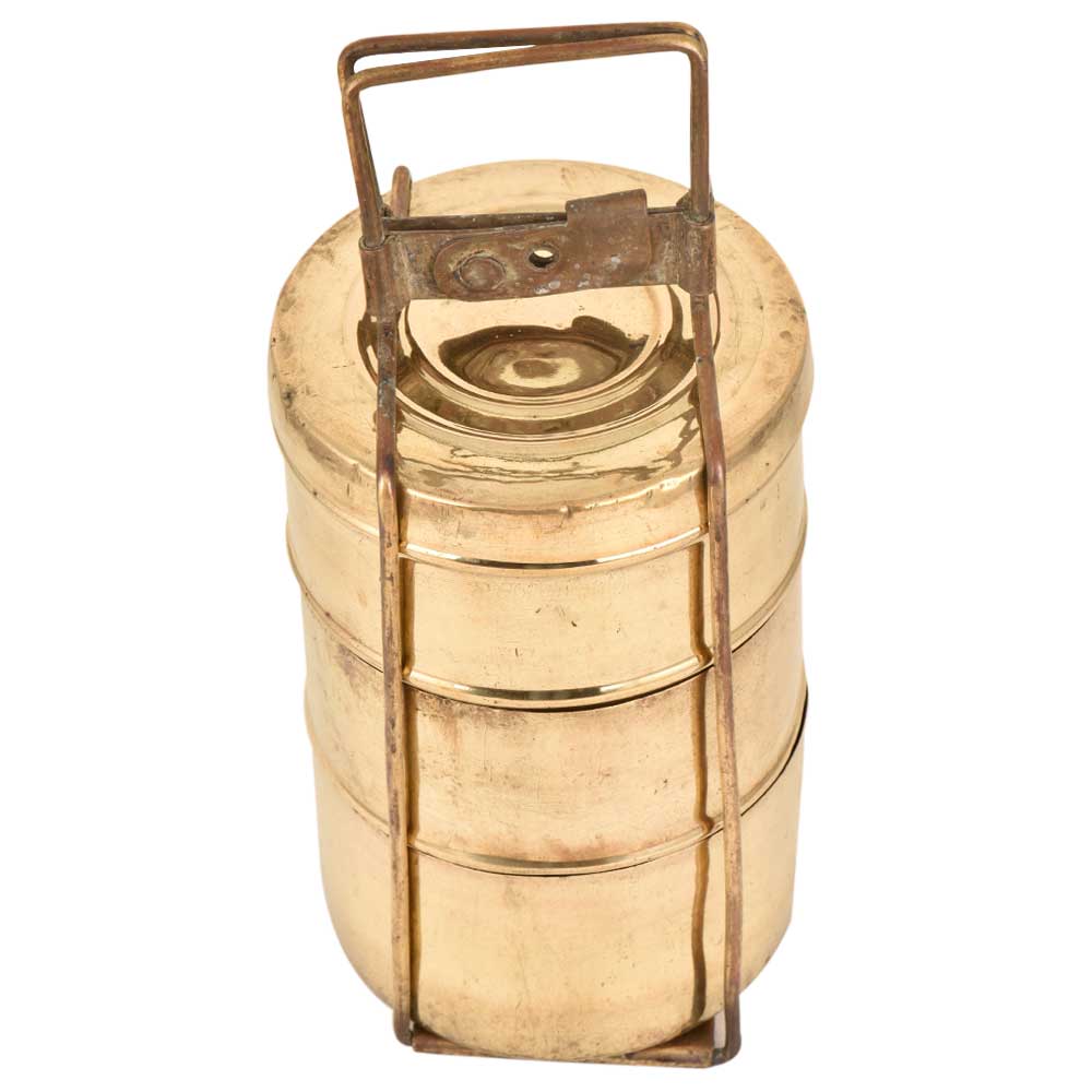 The brass three compartments Tiffin box is a very popular Indian household item. The lunch box is made of very high quality brass it comes with three storage boxes that are stacked one above the other and secured with the help of a clasp. Now used as a table ornament, jewelry storage and for presentation of food.